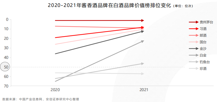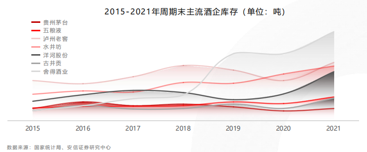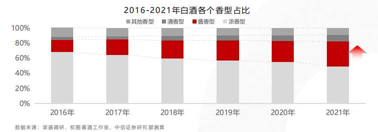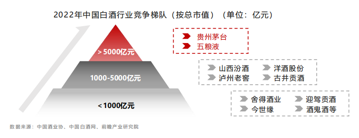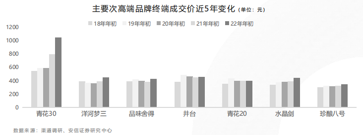 2022年上半年,中国白酒行业规模以上企业累计完成产品销售收入3436.57亿元,累计增长16.51%;得益于国家政策和数字化技术等因素的驱动,预计未来白酒行业发展稳定,2025年中国规模以上白酒企业市场规模将达9500亿元,利润将达2700亿元。受特殊事件影响,白酒线下消费受阻,自2019年起,主流白酒品牌普遍库存压力明显增大从竞争格局看,白酒行业仍保持以茅台为龙头,多家强军竞争的格局。2022年,贵州茅台总市值达到25576.19亿元,稳居第一,与位居第二、总市值达7749.63亿元的五粮液依然保持明显断层;再则是山西汾酒、泸州老窖、洋河股份和古井贡酒,总市值超1000亿元。目前,浓香型仍是国内白酒行业市场规模最大的白酒香型。但随着“茅台热”的带动及酱酒自身稀有的品质,酱香酒市场得到迅猛增长,逐步挤压浓香型的市场占有,未来有望赶超浓香型白酒成为第一大香型白酒;另外,清香白酒也凭借口感爽净和性价比高成为大众消费的新选择,市场份额也呈现逐年增长的态势。在线下消费受限,整体白酒市场规模趋于平稳的大环境下,酱香酒近年来始终保持高速增长的态势,2021年其同比增速超20%。高速的市场增长进一步带动白酒整体规模提升,助力白酒行业市场容量提升。随着“酱香热”的进一步提升,国内主流酱香酒品牌大多凭风直上实现品牌价值跨越。2020-2021两年内,大部分酱香酒品牌的品牌价值排位均有不同程度的提升,甚至跻身白酒品牌价值前50位,实现品牌梯队进阶。白酒行业市场规模的维稳,另一方面来自于次高端行业规模的增长。2021年,中国次高端白酒行业规模逼近800亿元,同比增速高达40%。得益于人民消费水平的升级,未来次高端白酒市场仍有望保持增长。近5年,国内主要次高端品牌终端成交价具有不同程度的变化,整体呈现价格升级的态势。其中青花30近5年价格实现翻番,直逼高端白酒队列。一方面,品牌通过调价探索价格空间;另一方面,品牌有望通过价格升级实现次高端到高端品牌的升迁。(三)分销渠道