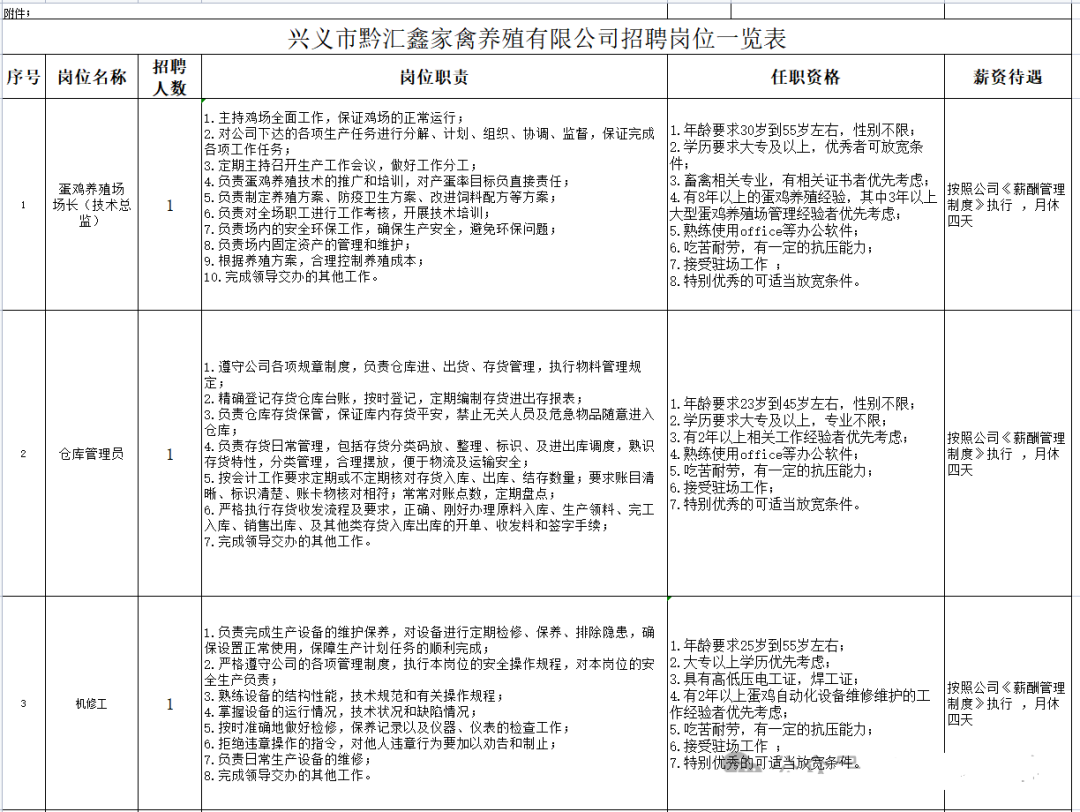 根据工作需要,公开招聘4名工作人员,具体招聘岗位及要求见《兴义市黔汇鑫家禽养殖有限公司2024年春季招聘工作人员岗位及要求一览表》(附件1)。