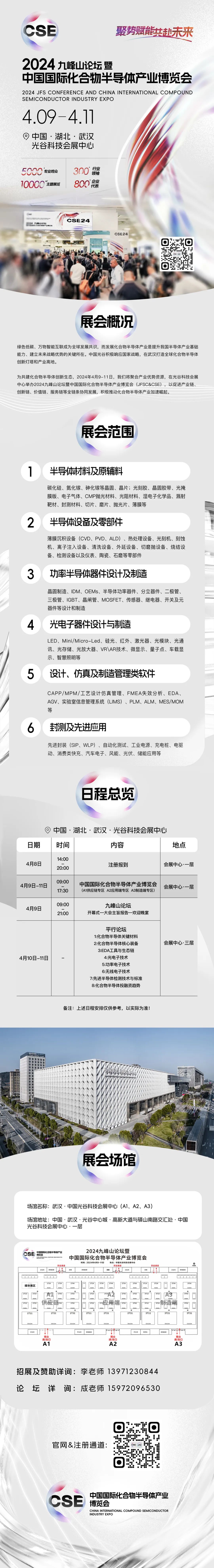 4月9-11日,2024九峰山论坛暨中国国际化合物半导体产业博览会将在武汉光谷科技会展中心盛大启幕。