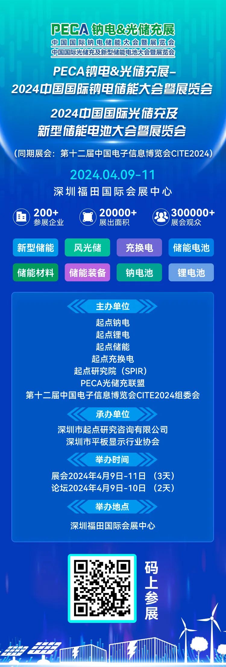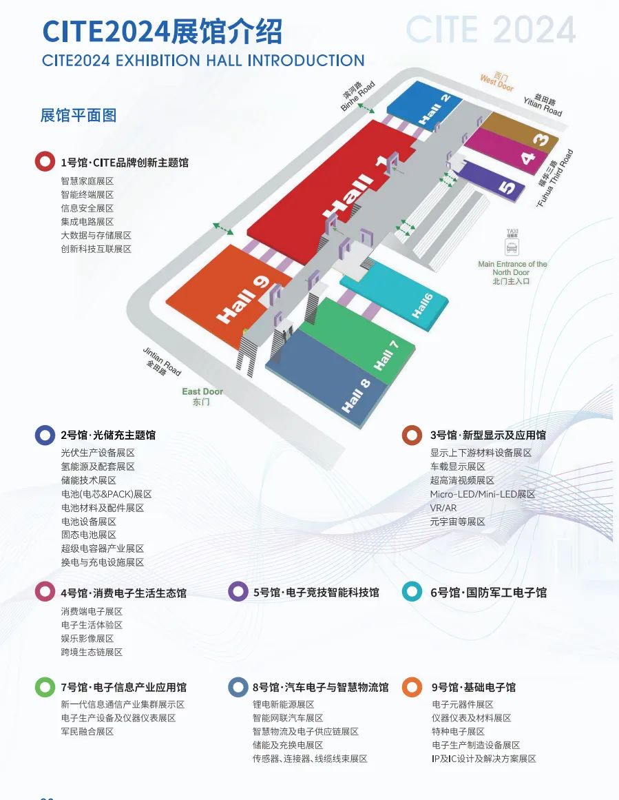 华为、比亚迪、阳光电源、中天科技、奥特迅、爱康科技、易事特、立能派、多氟多储能、远景能源、永泰数能、兴储世纪、时代联合、宏鑫达、行深智能、志成冠军、行深智能、江元集团、艾罗能源、奇点能源等中科海钠、维科技术、珈钠能源、金钠科技、博钠新能源、浦士达、天钠科技、果曼钠电、湖钠科技、钠能时代、传艺钠电、华阳股份、瑞扬新能源、欧科工业空调、尚水智能、联鹏智能、易事特钠电、超钠新能源、兴储世纪、众钠科技、钠创新能源、猛狮新能源、鹏辉能源、容钠新能源、贝特瑞等;宁德时代、弗迪电池、时代联合、中天储能、国轩高科、鹏辉能源、LG新能源、三星SDI、孚能科技、拓邦锂电、维科技术、创明电池、远东股份、中比新能源、多氟多、赣锋锂电等;储能零部件配套:EK储能温控、慧昊精密、中集智能、立能派、远景能源、海目星等CITE展馆分布(PECA-2024中国国际光储充大会暨展览会在2号馆)