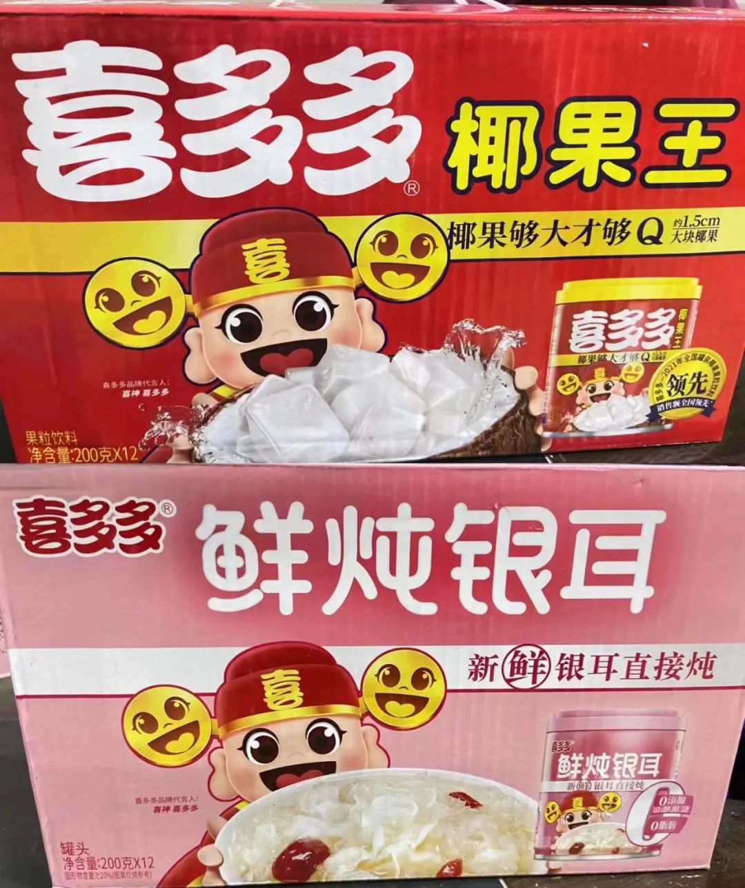喜多多,保质期两年,200*12罐,鲜炖银耳,9月份800提,椰果王,6月份200提,合计1000提