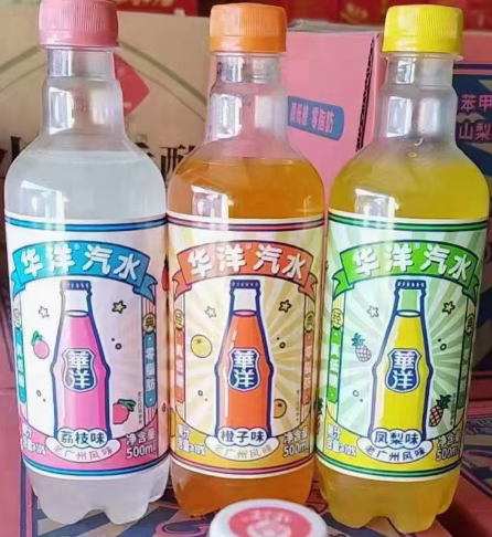 华洋汽水,23年5月,保质期一年,500✘9塑包,橙子,荔枝,风梨,青柠,4个口味,合计3000箱。