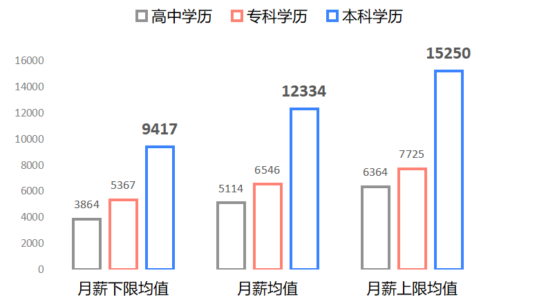 如图所示,不同学历带来的薪资差距是非常大的,月薪均值差达到了近6千元。