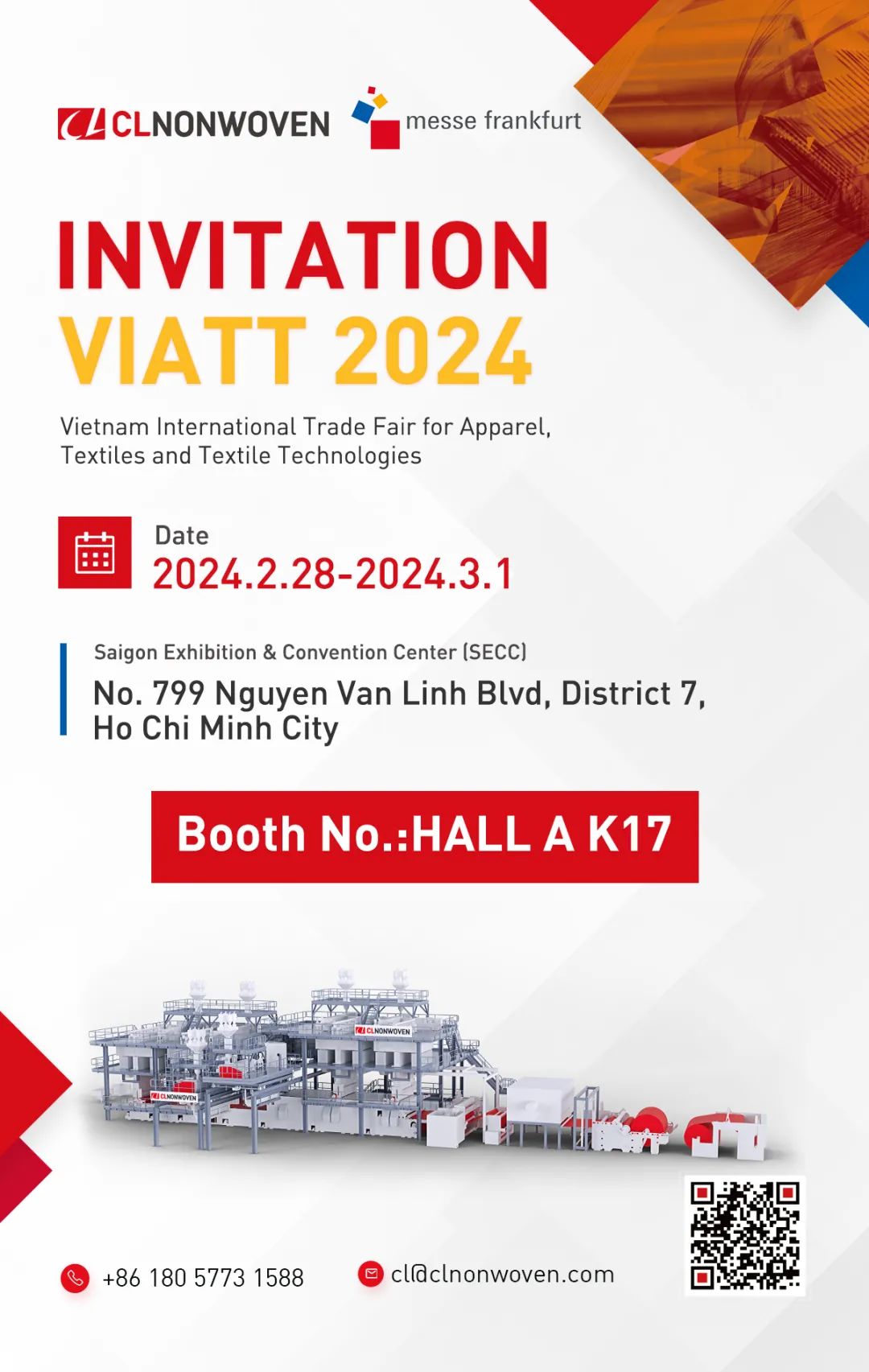 首届越南国际服装、纺织品及纺织技术博览会(VIATT)将于2024年2月28日至3月1日在西贡会展中心(SECC)展馆A及B1瞩目亮相。朝隆纺机作为中国纺熔非织造行业的领军企业,将携最新的纺熔非织造装备技术及创新产品亮相此次展会。