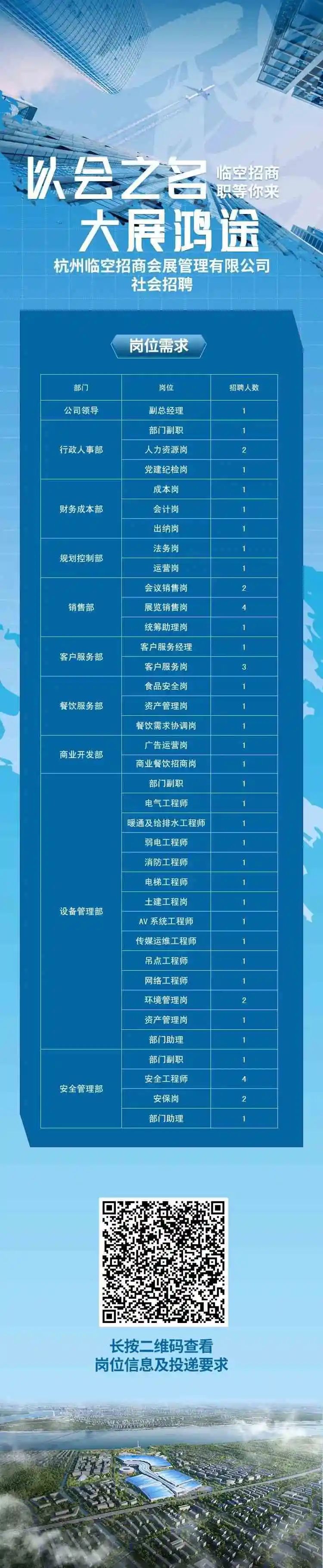 杭州临空招商会展管理有限公司,为杭州大会展中心场馆运营管理单位,是由杭州市大会展中心运营管理有限公司携手深圳市招商会展管理有限公司共同成立的合资公司,于2023年12月27日注册成立。因公司发展和工作需要,现对外招聘岗位若干,具体如下: