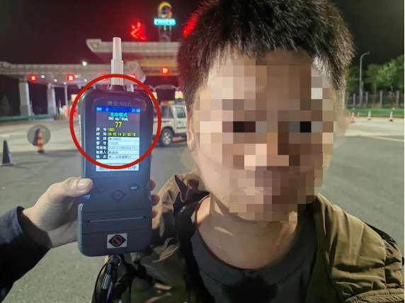 2月14日21时55分,凌云交警在凌云高速收费站对一辆小车例行检查时,车内的酒味扑鼻而来,民警立即对其进行呼气式酒精检测,结果为77mg/100ml,达到饮酒后驾驶机动车标准。