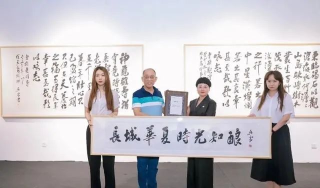 这次展览延续了“共融”的主题,更深入地探讨了“共生”的核心理念。将书法艺术与葡萄酒文化相结合,不仅展示了中华文化的博大精深,也彰显了多元魅力。艺术家吴雪慷慨地赠送了他的书法作品《长城华夏时光知酿》,这件作品以独特的艺术风格诠释了长城葡萄酒的精髓。长城酒庄也通过回赠证书的方式表达了对吴雪的诚挚感谢,彰显了跨界合作与文化交流的积极意义。