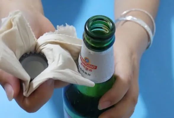然后烤热两分钟后准备张纸巾,用纸巾包裹着啤酒盖,我们只需轻轻一拧啤酒瓶盖就打开了。不知道大家有没有明白其中的道理呢?用火烤一下啤酒瓶盖,通过热胀冷缩的原理使瓶盖松动,这样我们只需轻轻一拧就能打开了,用纸巾包着瓶盖,不仅能隔绝瓶盖上的温度还能增大摩擦力。这个小窍门是不是非常的方便呢?
