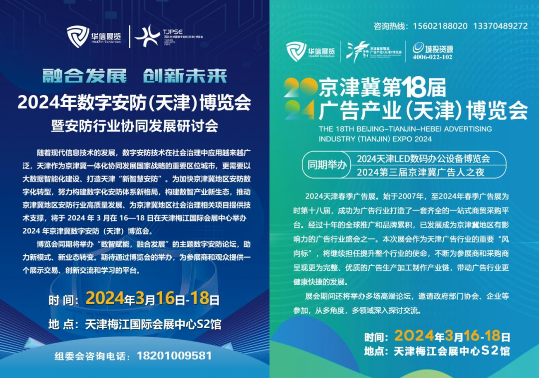 本届博览会旨在加速京津冀地区安防数字化转型,构建数字化安防体系新格局,推动安防行业高质量发展。博览会期间还将举办以“数智赋能,融合发展”为主题的数字安防论坛,助力推动新模式和新业态的转变。与此同时,2024年京津冀广告产业博览会(天津春季广告展)也将于同一时间在梅江会展中心举办。展会将为参展商和采购商呈现更加完整、优质的广告生产加工制作产业链,致力于搭建一站式商贸采购平台,为广告行业的发展提供动能。同时,展会期间还将举办天津LED数码办公设备博览会和2024第三届京津冀广告人之夜等活动。