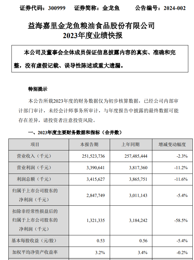 2023年公司实现营业收入2515亿元,同比下降2.3%;归属于上市公司股东的净利润28.5亿元,同比下降5.4%;实现归属于上市公司股东的扣除非经常性损益的净利润13.2亿元,同比下降58.5%。