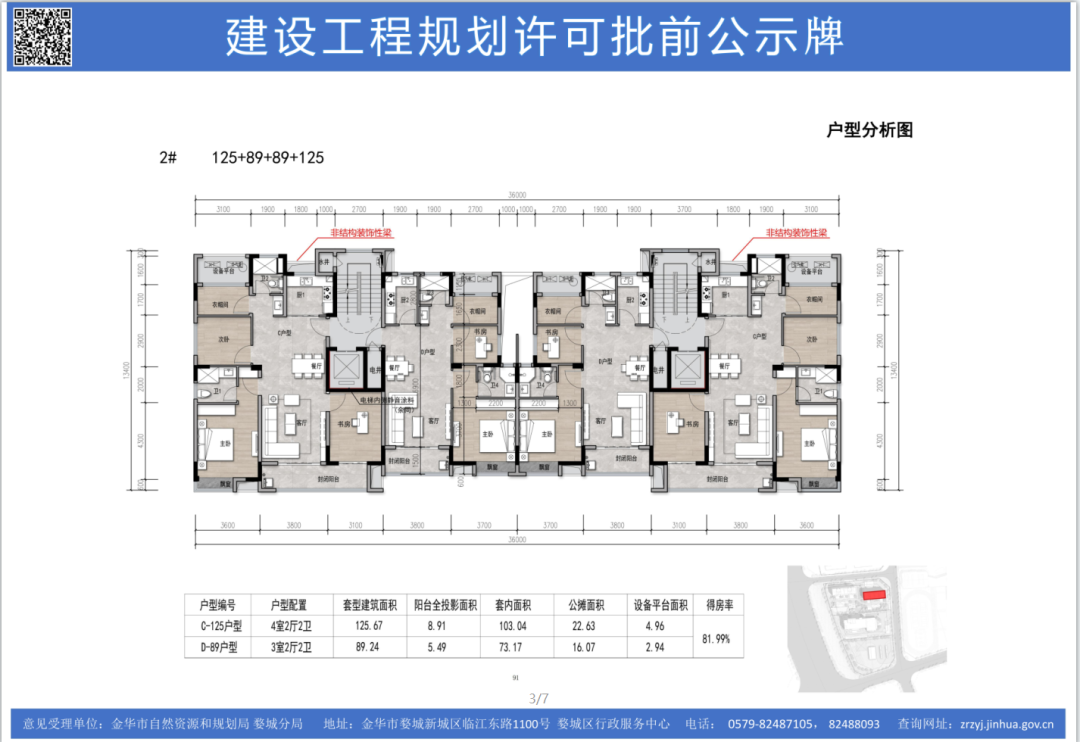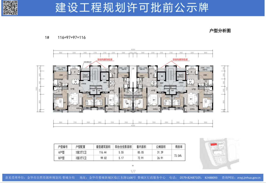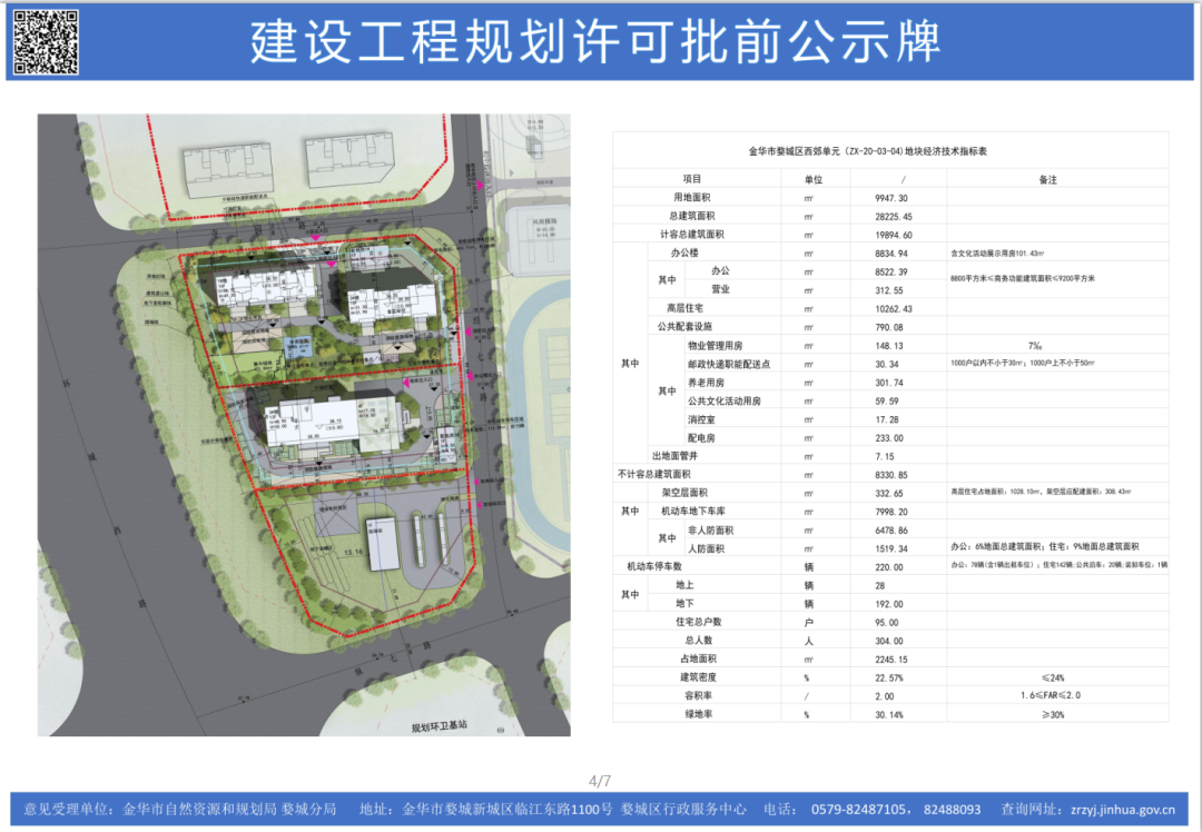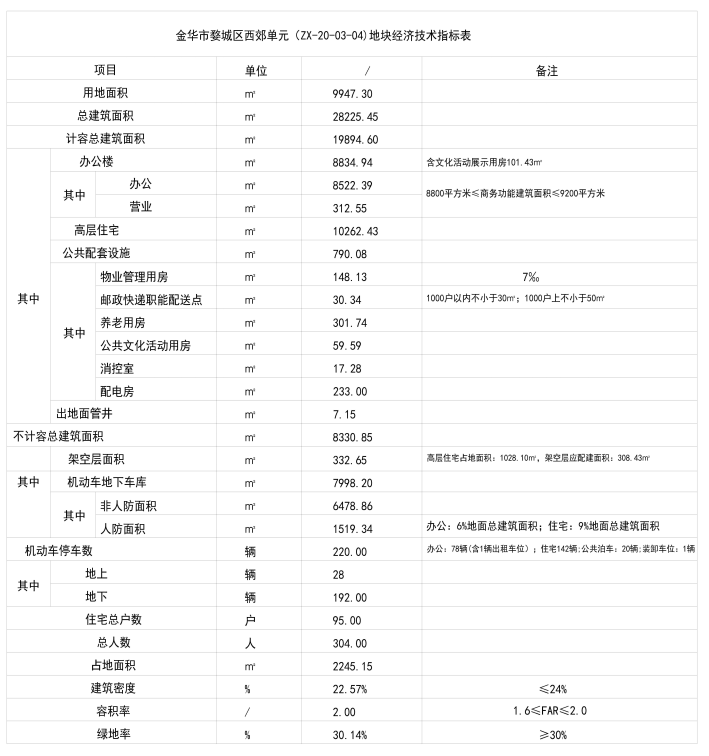 本项目位于金华高铁新城区块,具体在环城西路以东、经七路以西、寺园路以南、纬七路以北。规划总用地面积为9947.3平方米,容积率2.0,建筑密度22.57%,绿地率30.14%。拟建建筑为居住、办公。