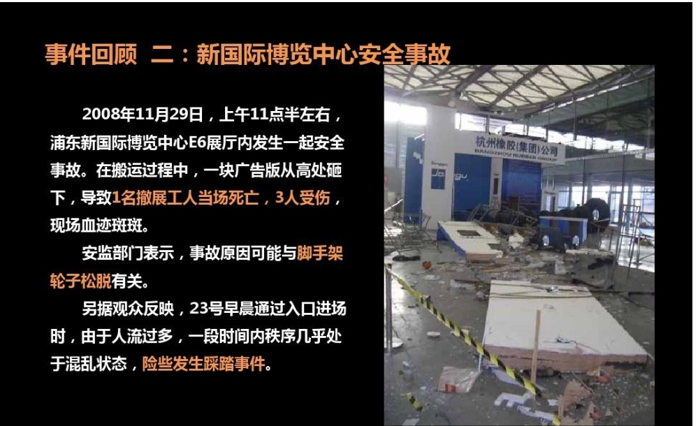 参展商为了达到更好的效果对搭建商要求通透性,美观性等,目前场馆对展会期间进场搭建展台的施工要求不一样,有的场馆强制性要求购买进场施工方购买展会保险,有的场馆是主办方来购买全部展馆保险保障,不过保额一般都不高,我统计了一些会展近年来发生的事故。