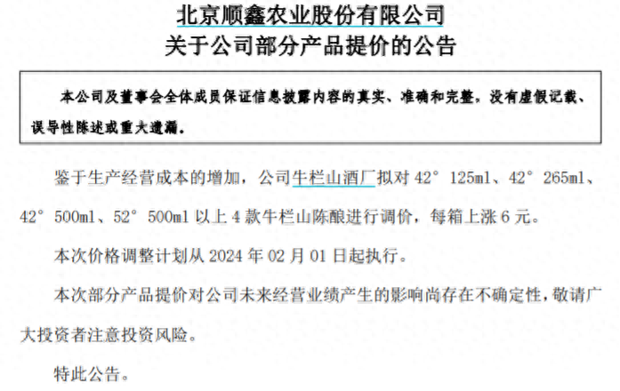1月12日,顺鑫农业发布公告称,将从2024年2月1日起,上调4款牛栏山陈酿价格,每箱上涨6元。4款牛栏山陈酿将涨价2月1日起执行