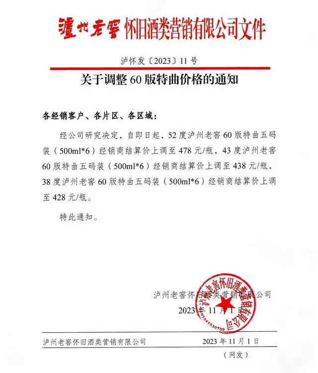 而在这之前,泸州老窖通知文件显示,52度泸州老窖60版特曲五码装(500ml×6)经销商结算价上调至478元/瓶,43度泸州老窖60版特曲五码装(500ml×6)经销商结算价上调至438元/瓶,38度泸州老窖60版特曲五码装(500ml×6)经销商结算价上调至428元/瓶。