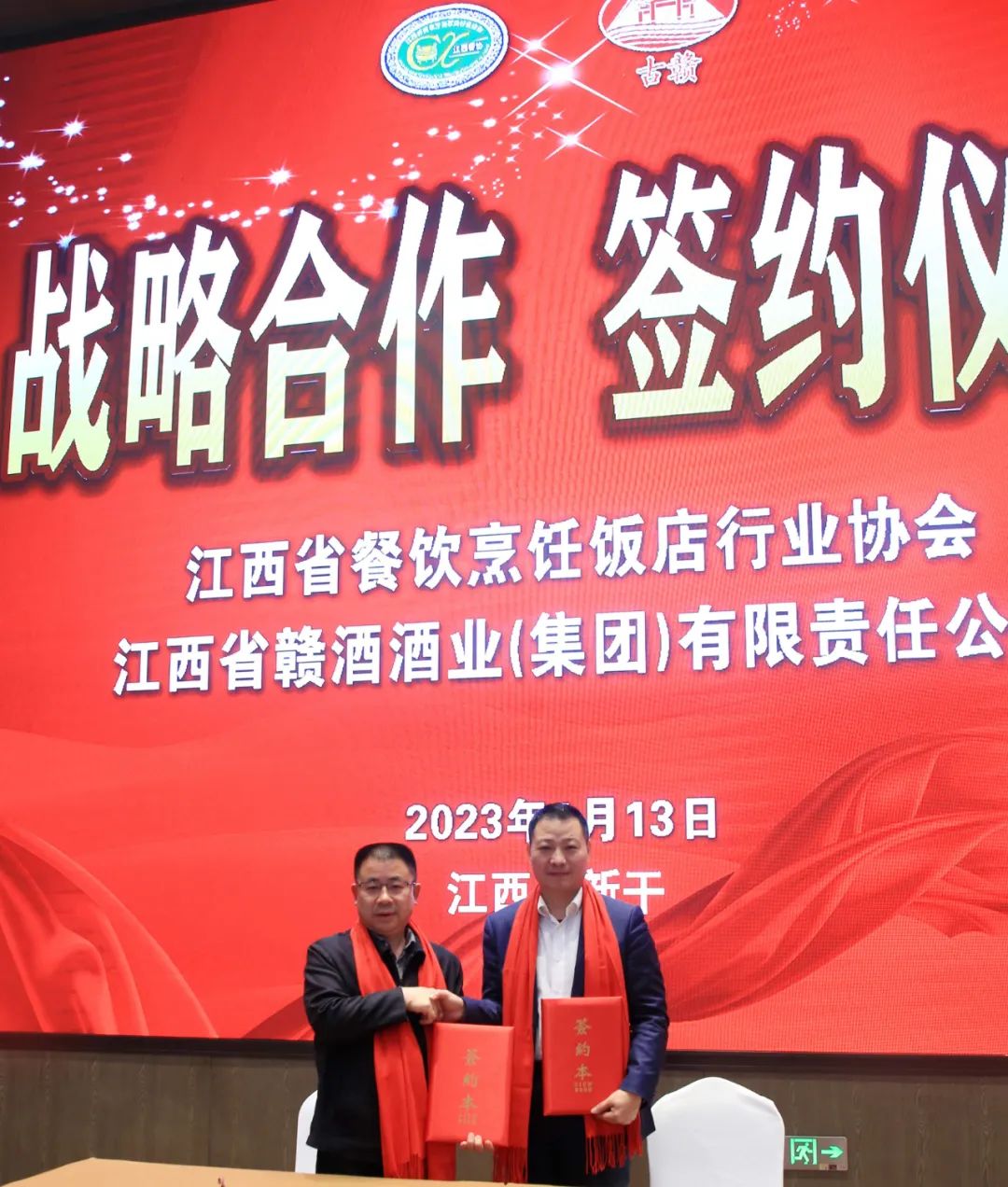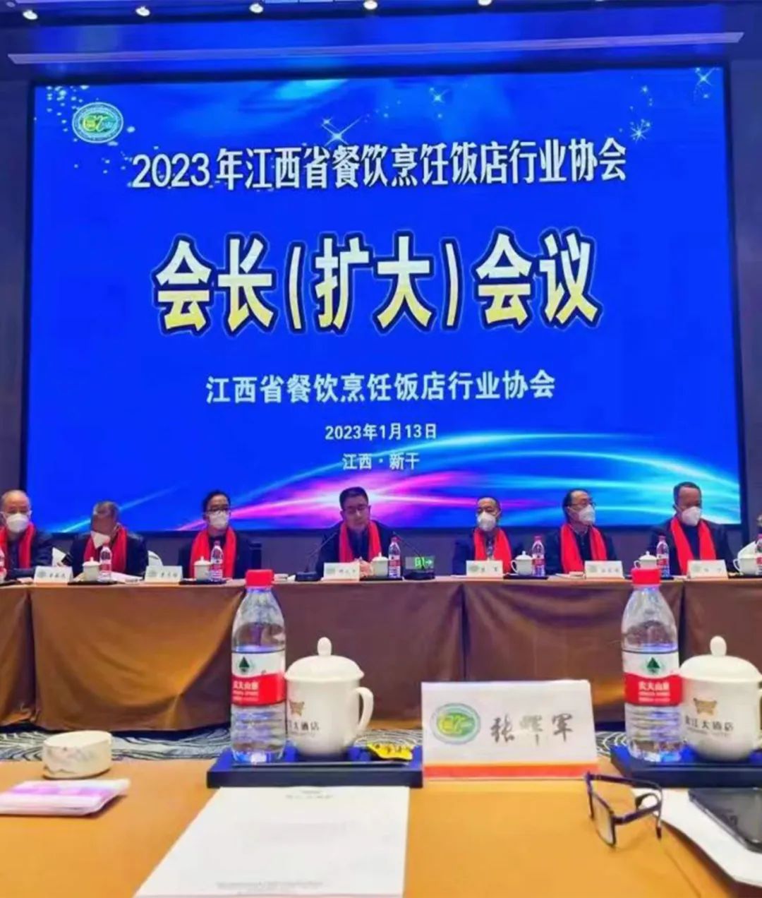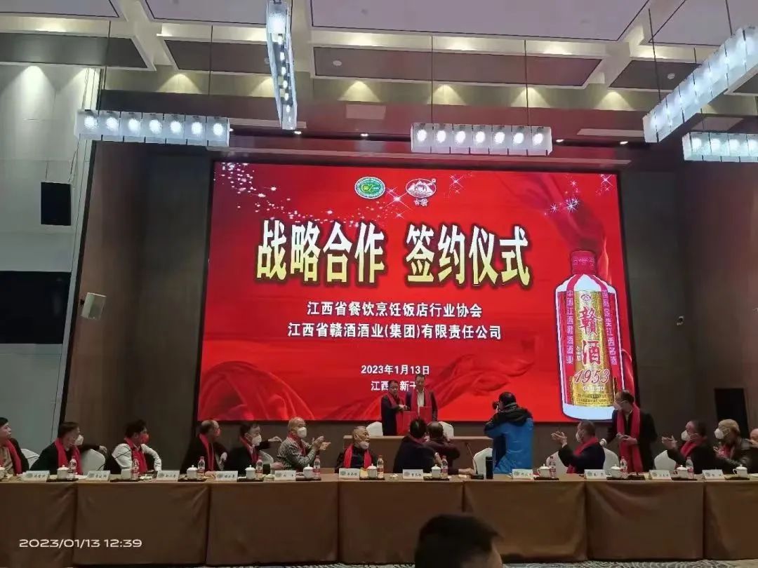 2023年1月12日-13日,2023年江西省餐饮烹饪饭店行业协会会长(扩大)会议在新干滨江大酒店隆重举办。邓火平会长等100余会员参加会议,会议承办方江西省赣酒酒业(集团)有限责任公司董事长张辉军出席会议,现场与江西省餐饮烹饪饭店行业协会签订了战略合作。