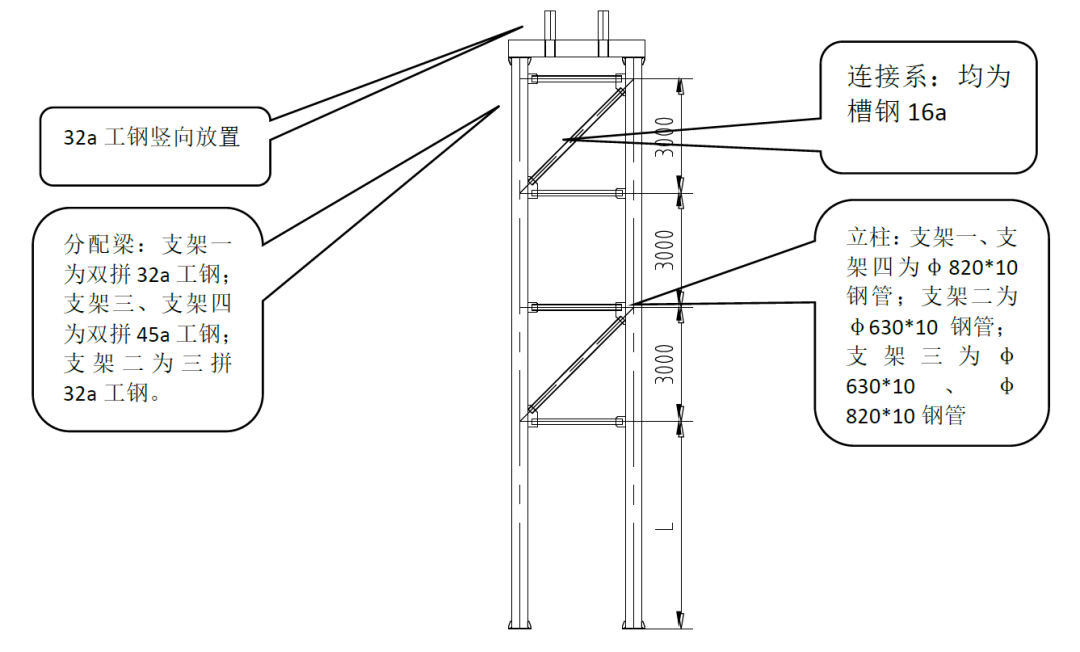 拱肋支架按高度和长度共分为4种支架类型,支架规格为3×3m。支架一用于拱脚位置对拱肋的支撑,支架二和支架三用于70米跨中间拱肋的支撑,支架四用于40米跨拱肋支撑,及连接二号和三号支架之间的顺桥向连接系,拱肋支架采用φ630×10和φ820×10钢管,连接系采用槽钢16a,分配梁采用双拼工钢32a和45a。