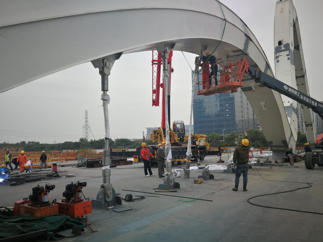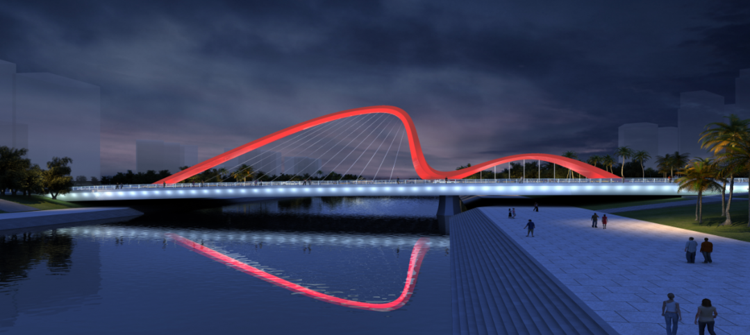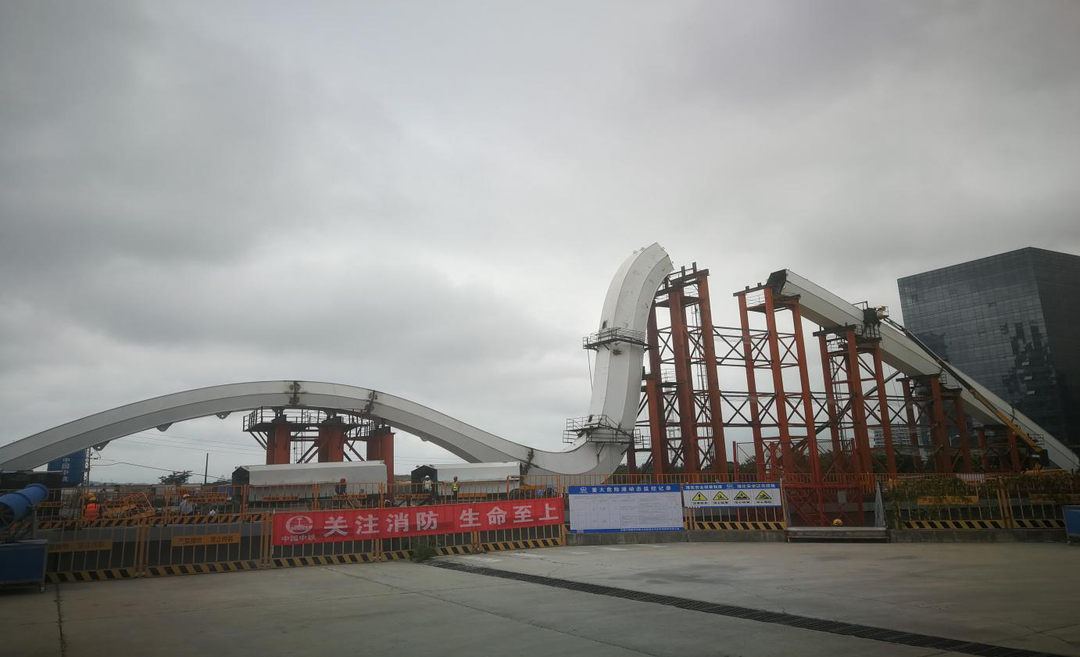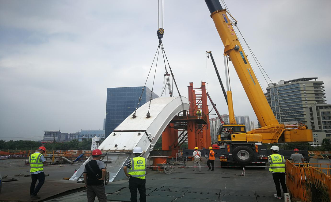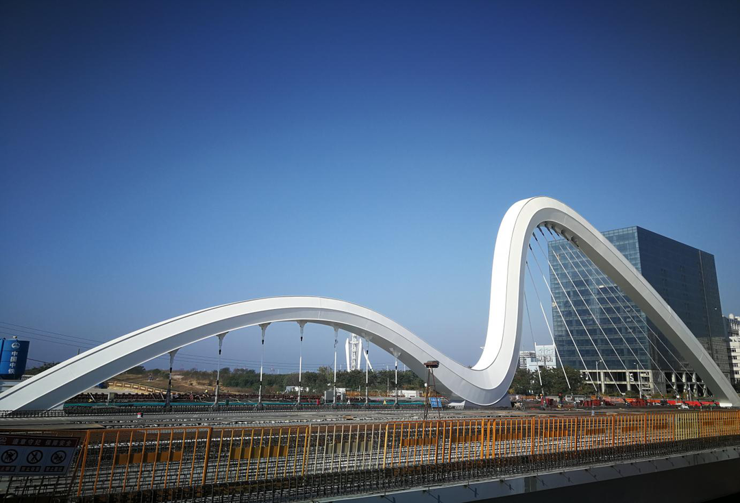 前海合作区听海前海桥工程桥拱设计为红色飘带,结构新颖、造型优美、技术含量高、施工难度较大。