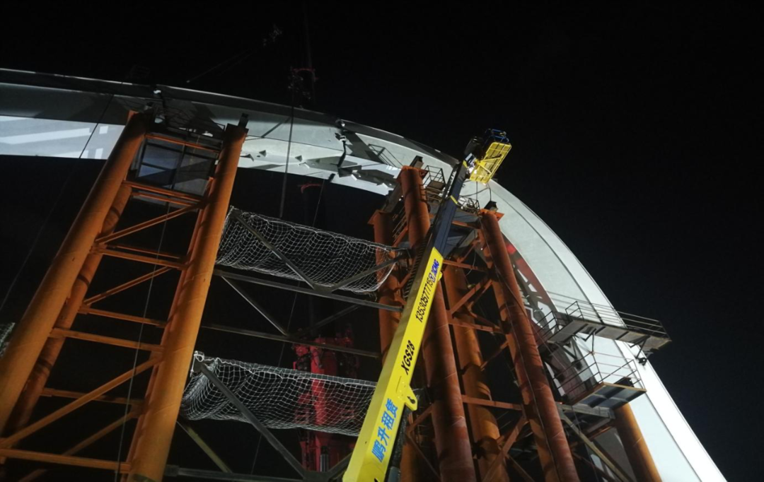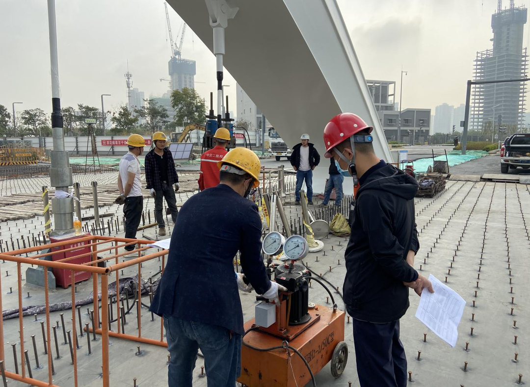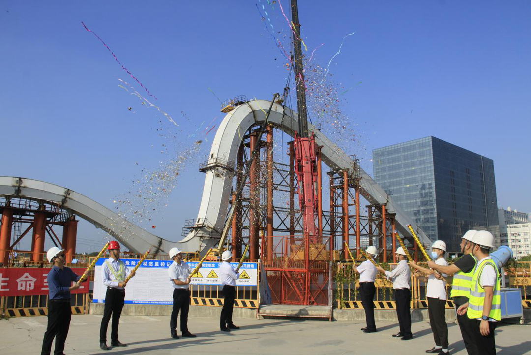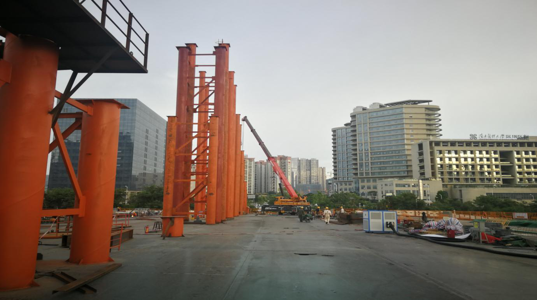 前海合作区听海前海桥工程桥拱设计为红色飘带,结构新颖、造型优美、技术含量高、施工难度较大。