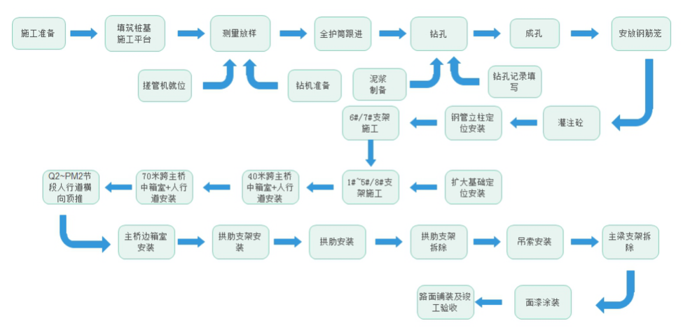 本项目根据工程特点和施工关键技术点,合理划分了钢拱节段和重量,采用支架高空分段吊装,通过分析安装工况,确定了整体施工方案,优化了整体安装流程,降低了安全风险,并研究总结了桥拱安装、合拢及吊杆安装技术要点,取得良好的施工效果,为全桥拱梁快速标准化施工提供系统方法和经验。