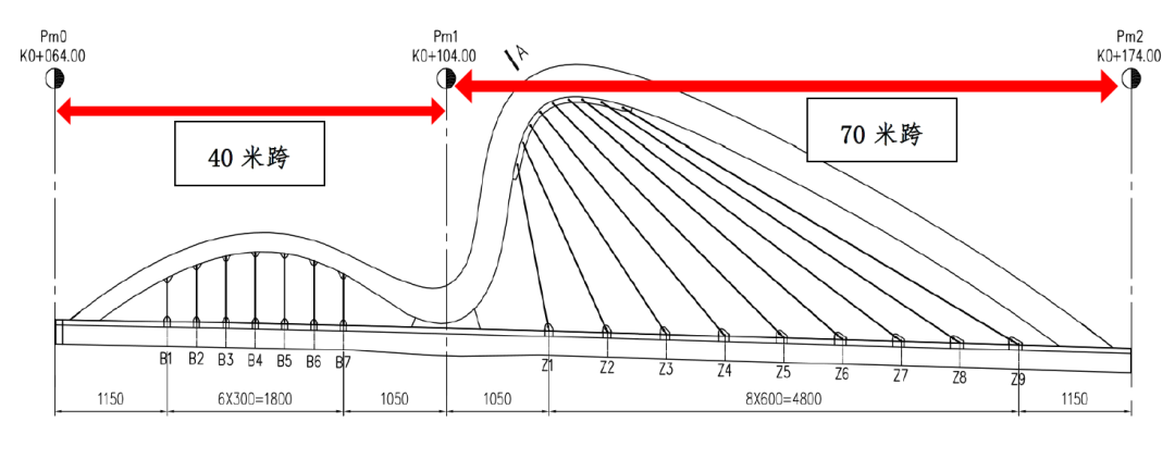 全桥吊杆共16根,40米跨7根,70米跨9根,吊索采用成品索,钢丝标准强度不低于1770MPa。40米跨吊杆编号分别为B1~B7,70米跨吊杆编号分别为Z1~Z9。