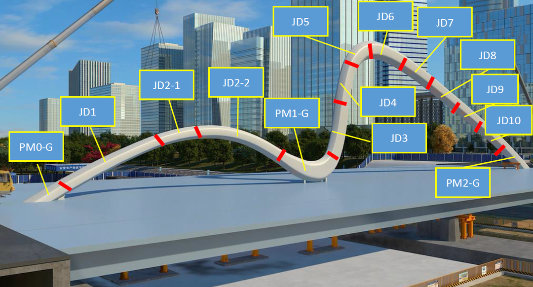 拱圈采用钢结构,异形拱轴线,其中主拱圈跨度为70m、高23m、矢跨比约为1/3;副拱圈跨度为40m、高8m、矢跨比1/5。主拱共分为14个节段,编号为PM0-G、JD1、JD2-1、JD2-2、PM1-G、JD3~JD10、PM2-G。其中PM0-G、PM1-G、PM2-G为拱梁结合段,JD5+JD6为合拢段。