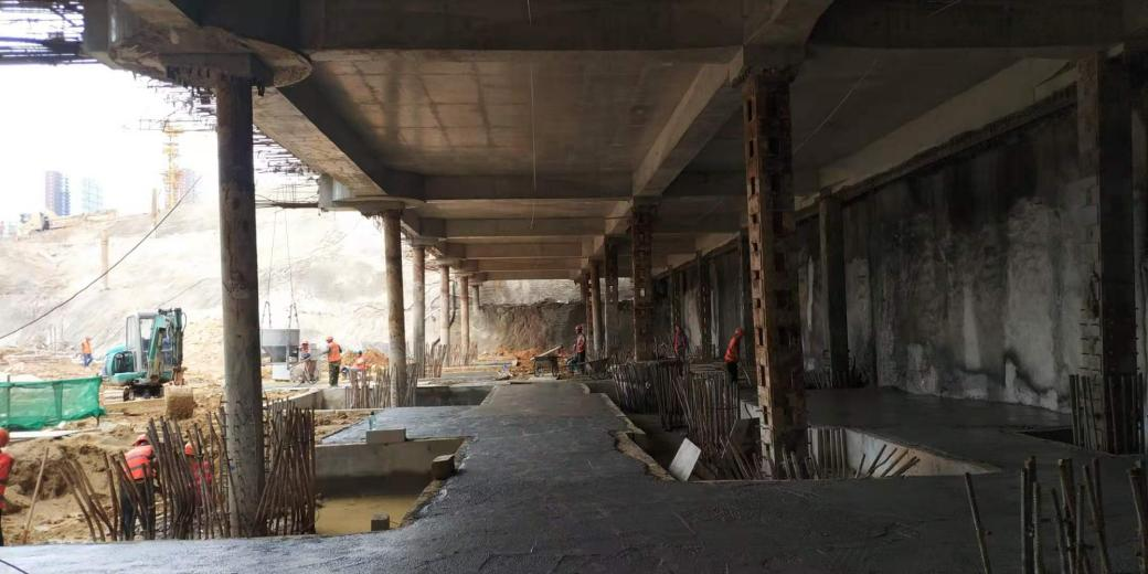 桩基施工完成后,进行基坑的开挖工作,本项目基坑开挖方式为中心岛式开挖,先分层开挖至B1层结构板底2.4m,基底标高-10.05m,土质为淤泥质黏土,场地平整后浇筑垫层,垫层混凝土标号C20,垫层厚度100mm,地下一层环板施工采用矮支架搭设,支架搭设高度2.3m。