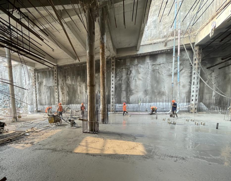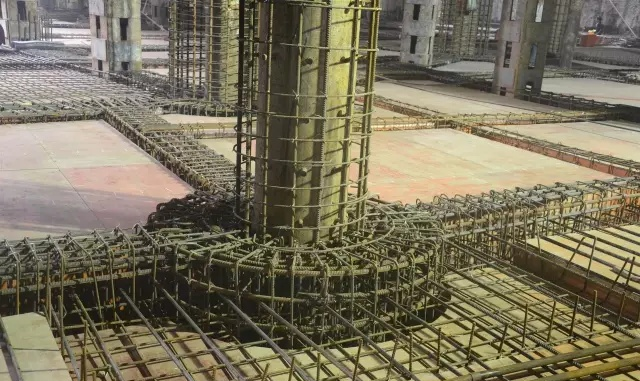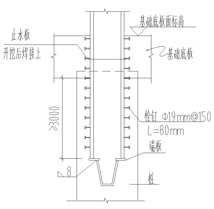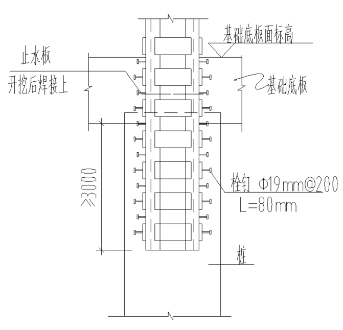 防水铺设施工完成,现场进行测量放线,并进行复核,复核无误后进行承台及底板钢筋绑扎工作,钢筋绑扎过程中,同步对钢管柱、格构柱焊接止水板。