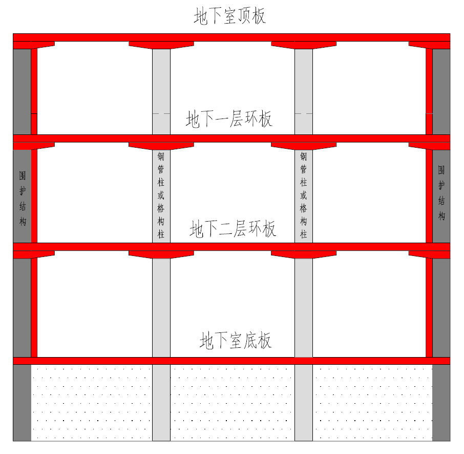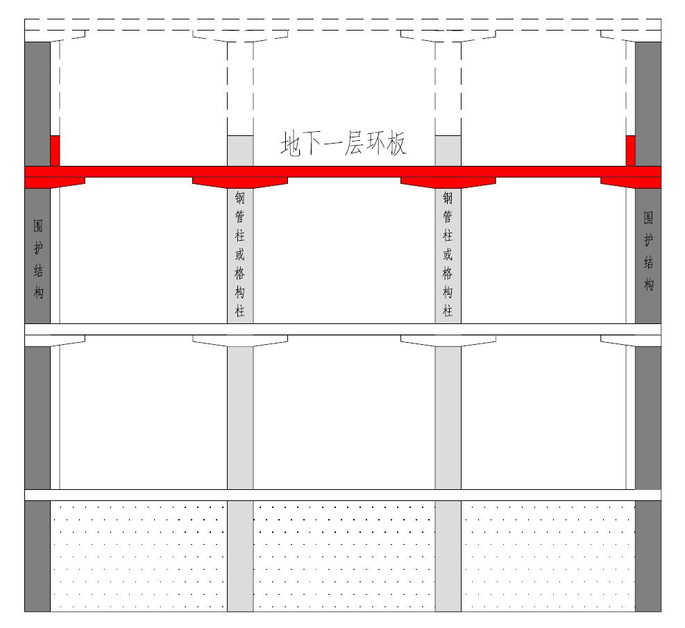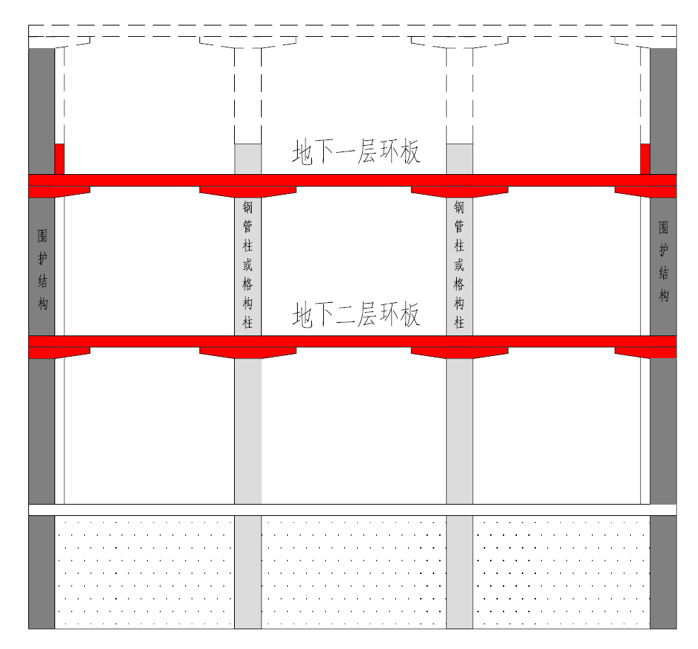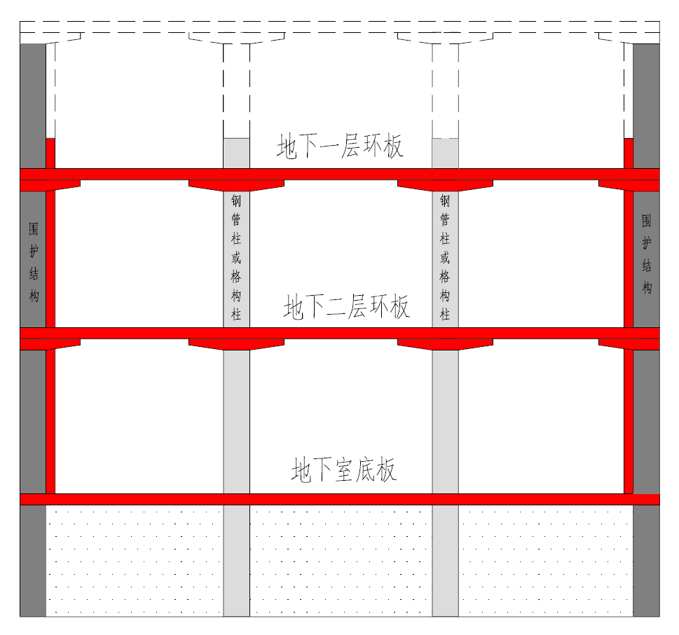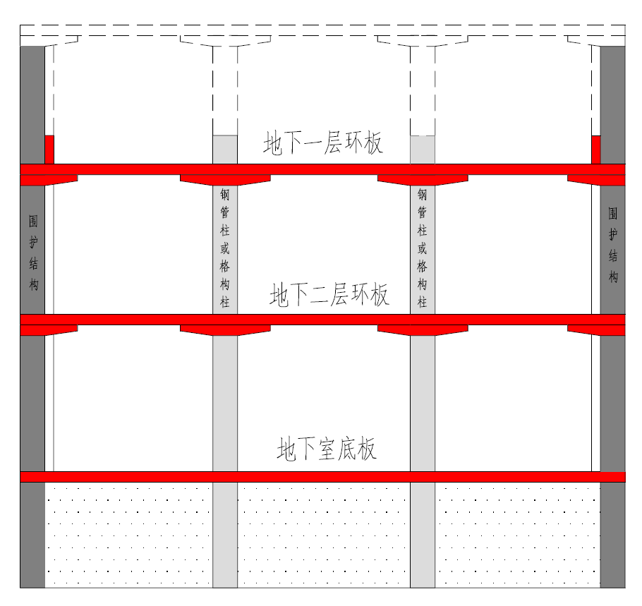 地下一层环板施工完成后,待混凝土强度达到设计强度的100%,对支架进行拆除,盖挖至地下二层板底2.4m,基底标高-13.85m,重复地下一层环板施工步骤,施工顺序为:矮支架搭设→模版铺设→钢筋绑扎→混凝土浇筑,施工过程中,仍需向下层预留浇筑孔及墙柱等竖向构件钢筋接驳器。