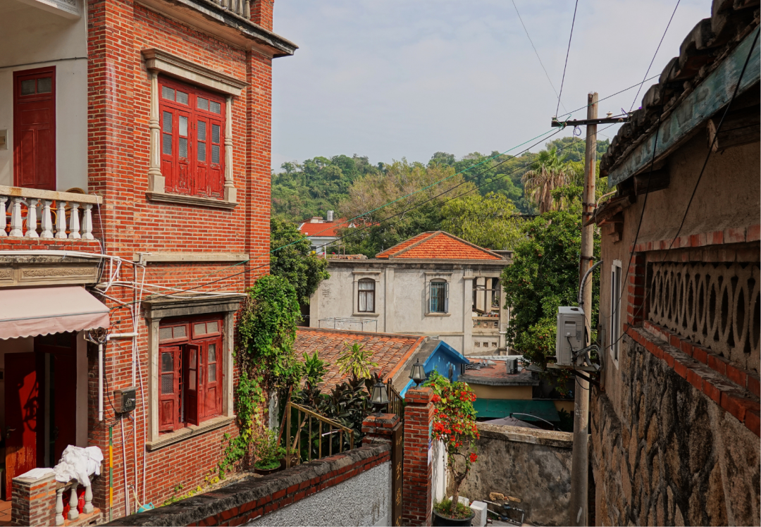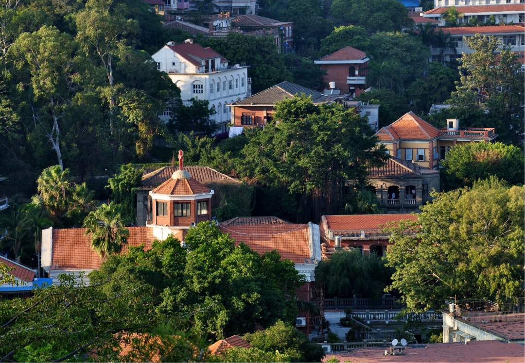 鼓浪屿全岛的绿地覆盖率超过40%,植物种群丰富,各种乔木、灌木、藤木、地被植物,或孤植于房前屋后,或列置于坡前路边,或群植于庭院绿野。所到之处,一定是满目的绿色,仿佛置身电影场景之中。
