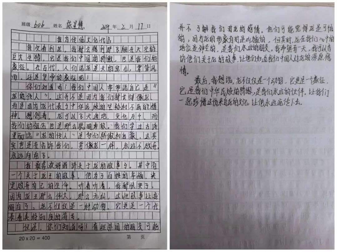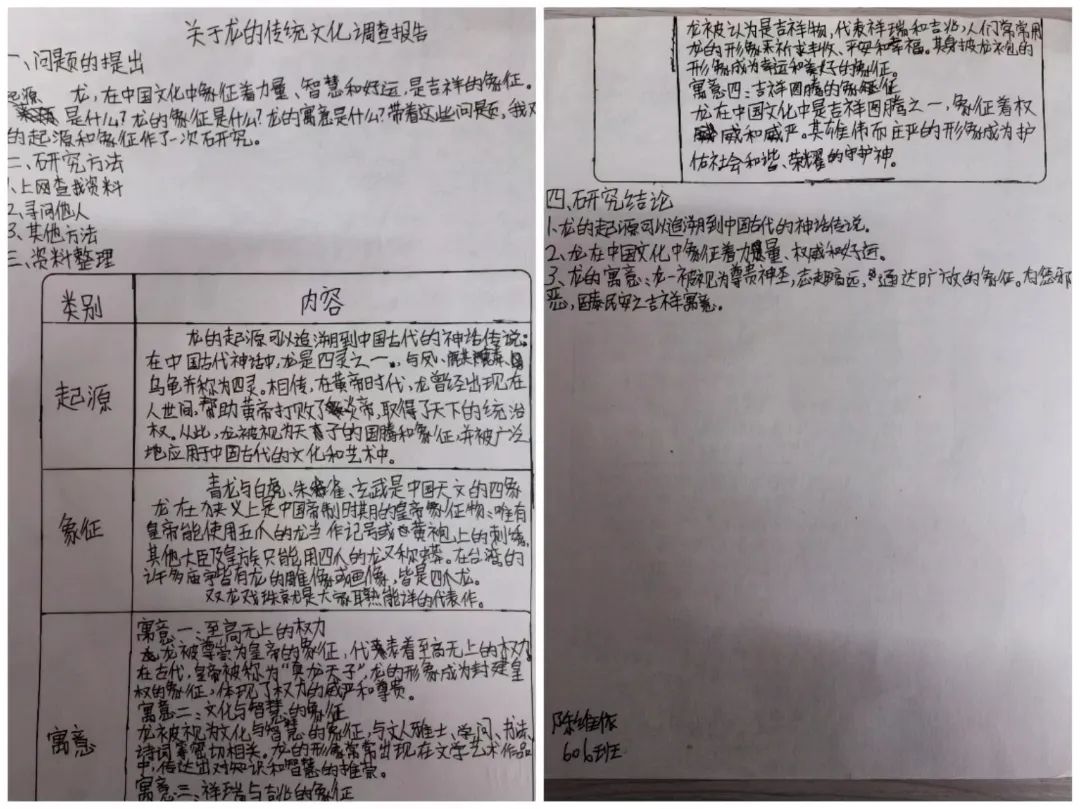最美的事不是留住时光,而是留住美好回忆。六年级的孩子探索关于龙的传统文化,用实际行动感受春节习俗,体验春节传统文化,用笔尖记录调查的小报告或“我为传统文化代言”的作文。
