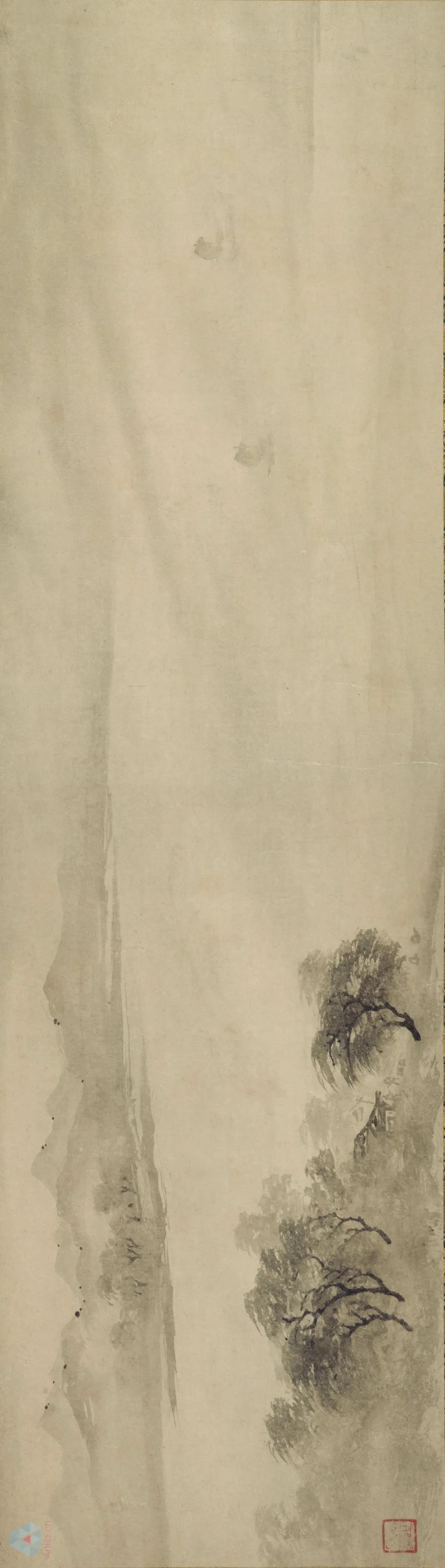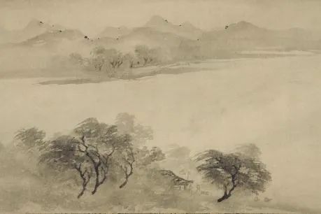 《远浦归帆图》以水墨表现烟波浩渺的江面,水天一色,若离若虚,远浦、归帆、湖光、天色皆融入到一片空幻迷蒙、幽深玄远之中。画面虽然表现的是急风暴雨.但并没有压抑和窒息,还是雾蒙蒙,雨蒙蒙,充满了机趣和平和。水面空阔,雨丝淡淡,真有船子和尚所说的“终日江头理棹间,忽然失济若为还。滩急急,水潺潺,争把浮生作等闲”的韵味。《远浦归帆图》首先所见是左下角以疾驰之笔描绘出来的狂风中飘摇欲倒的树木,不见枝叶,只见歪斜的树形,定睛凝眸才会发现雾霭中若隐若现的“归帆”。