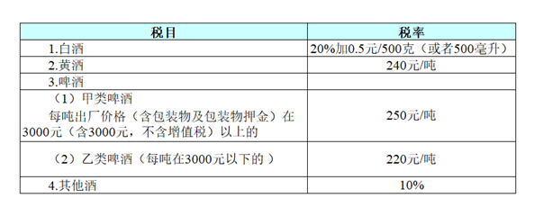 通过税率表我们可知,白酒是从价定率和从量定额征税;黄酒和啤酒是从量定额征税;其他酒按照从价定率。