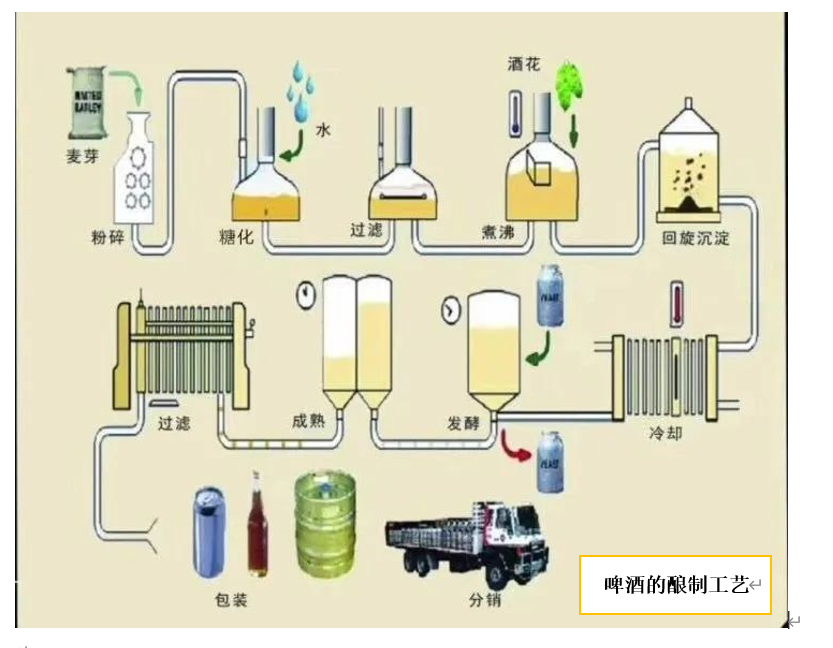 啤酒的酿制流程是:麦芽粉碎→糖化→过滤→煮沸 (加酒花)→旋沉→冷却→充氧冷却麦 汁(加酵母)→发酵。