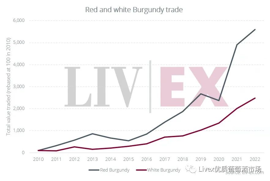 过去十年, 勃艮第葡萄酒交易不断增长。自 2010 年以来,该酒区在市场上交易的红酒总值增长了 5,491%;白葡萄酒也相对温和地增长了 2,383%。