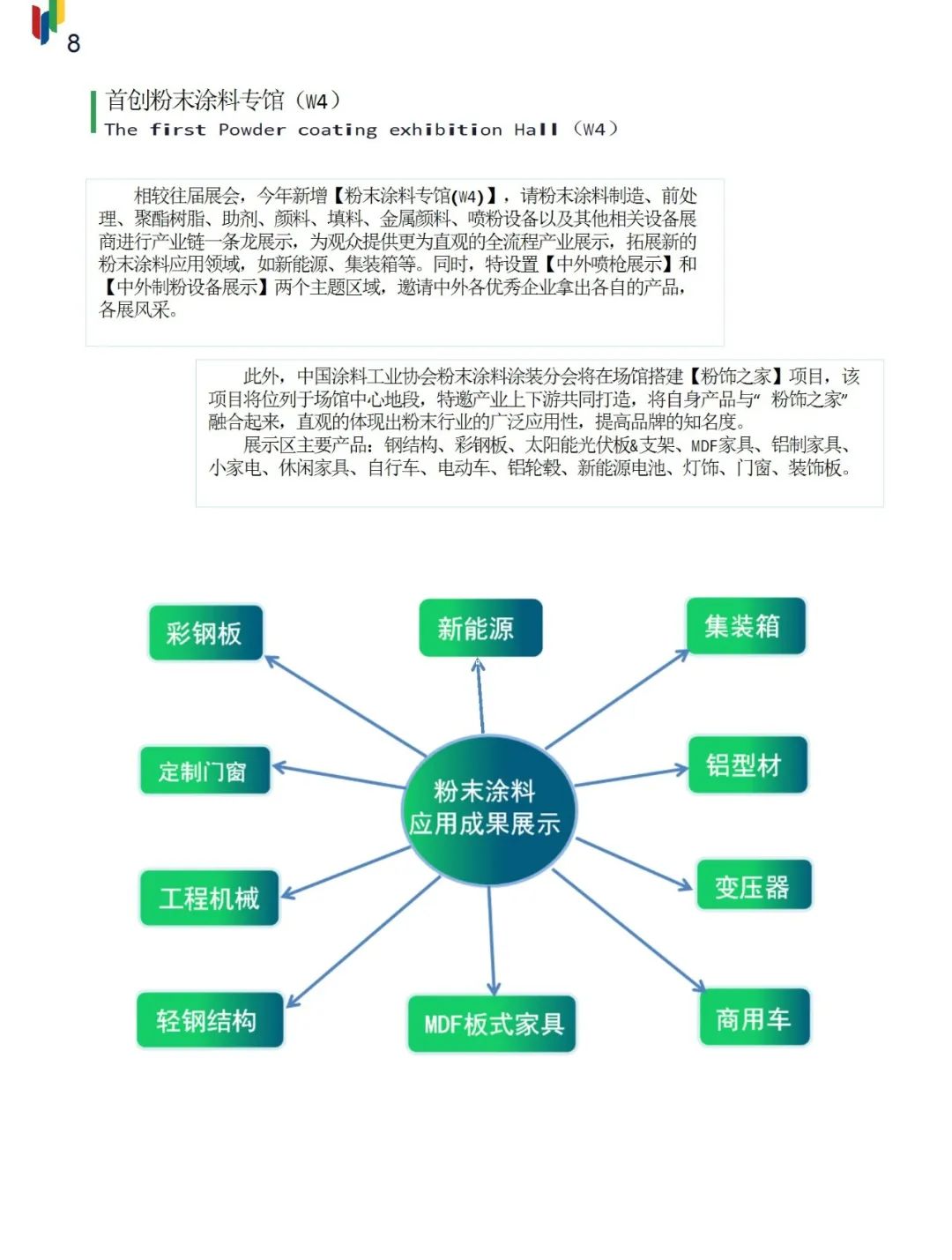 我们将召集行业上下游企业,粉末制造设备,聚酯树脂,环氧树脂,固化剂,颜料,铝颜料,珠光颜料,和助剂等各类原材料,涂装设备/喷枪,前处理,检测及实验仪器,粉末涂料等企业一起聚集参加。并在展厅中央区域由分会出资搭建“粉饰之家”,展出从家具,家电,日用品,灯饰,MDF定制家具,自行车,电动车,铝型材,铝单板,定制门窗,及新能源,民用轻钢结构,彩钢板,集装箱(部件),汽车零部件等众多且全面的粉末涂装产品,让观众一目了然的了解粉末涂装的应用领域和场景。在展会期间,我们会在粉末涂料专馆论坛会议区组织6场粉末涂装应用场景专场:新能源储能,MDF板式家具,钢结构,彩钢板,低温固化和硅改性树脂应用。我们会邀请众多下游用户行业协会和企业来展会与粉末涂装产业链企业对接,系统性推进漆改粉,水改粉,及探讨粉末涂料涂装产品技术发展趋势。让粉末涂料涂装的热度火起来! 粉末涂料涂装分会会员可享受展位价格88折优惠,趣涂料是本届博览会分会的招商合作伙伴。