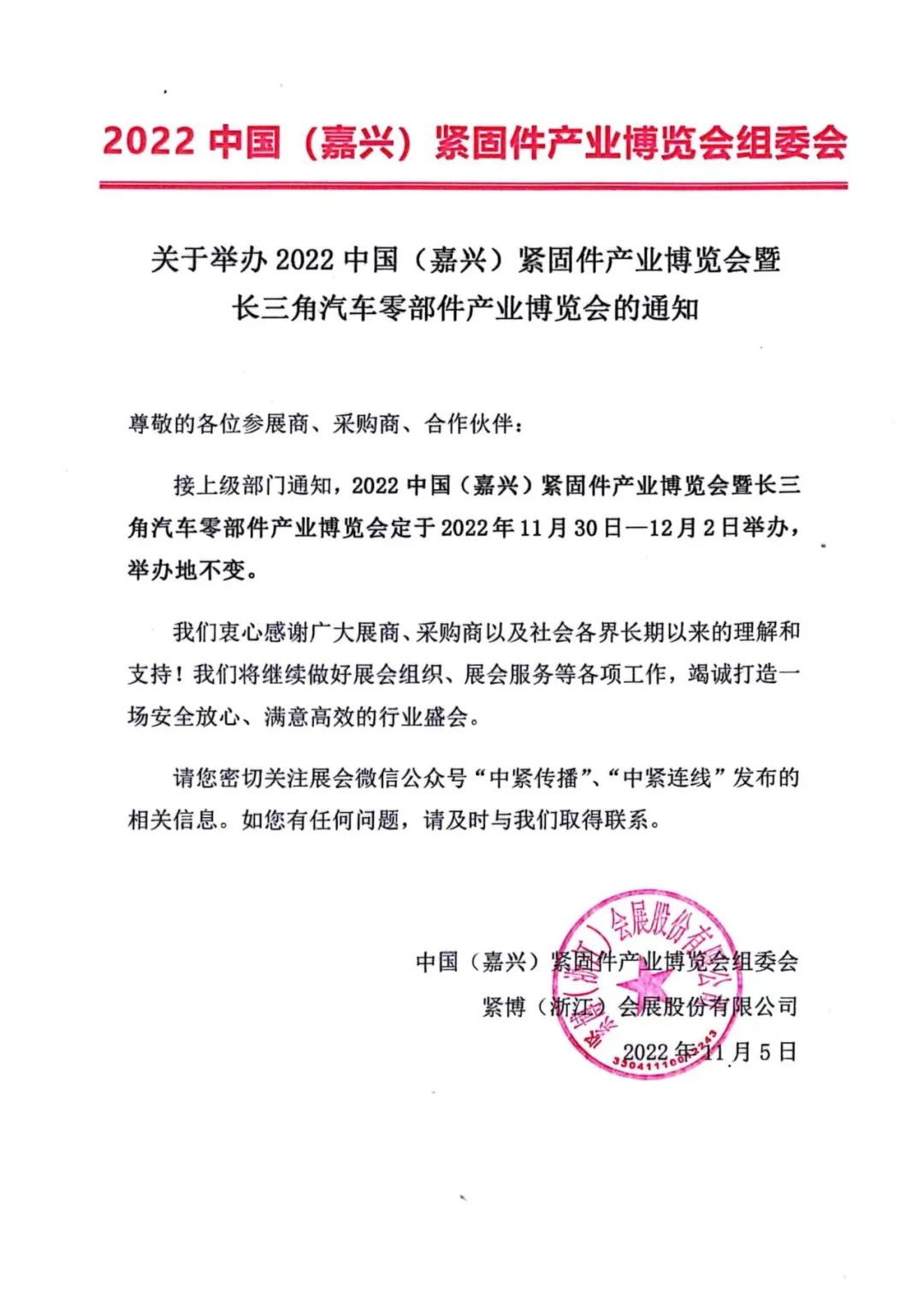 接上级部门通知,2022中国(嘉兴)紧固件产业博览会暨长三角汽车零部件产业博览会定于2022年11月30日-12月2日举办,举办地不变,为嘉兴国际会展中心。