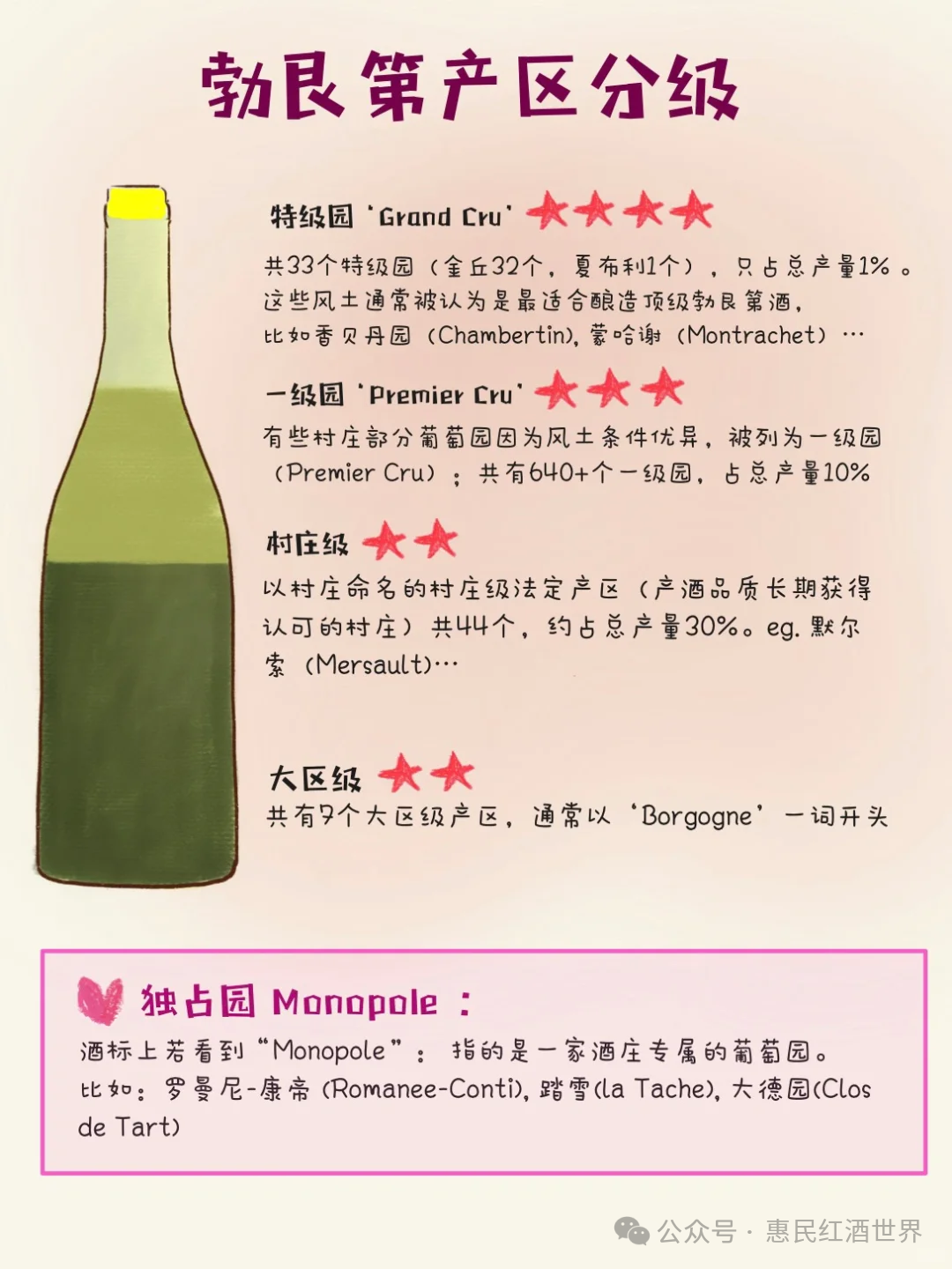 在勃艮第,葡萄酒根据自然和人文条件,被分为四个等级: