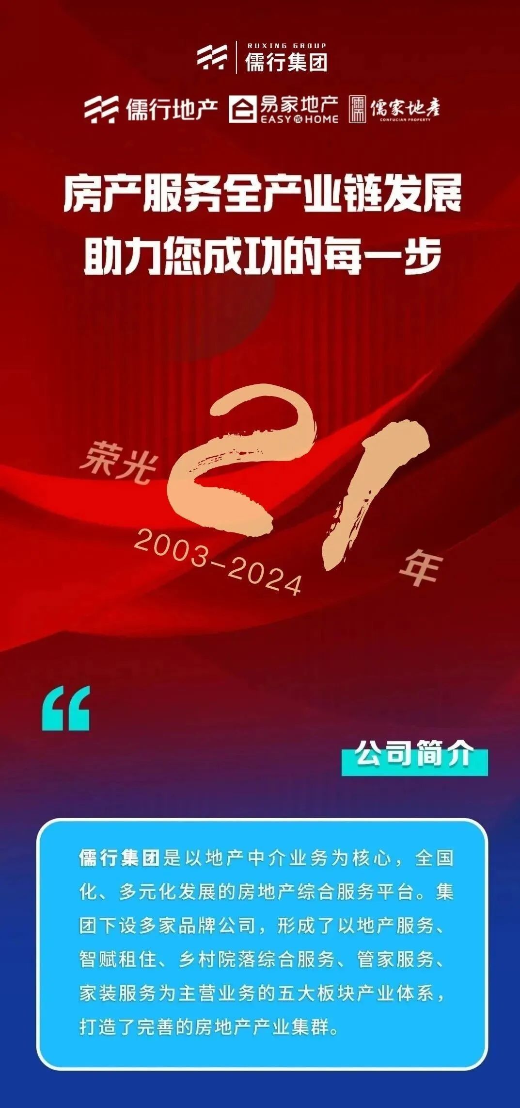 儒行集团旗下:易家地产、儒行地产、儒家地产、儒行好易租、民生美丽乡村、如行管家、儒行装饰、儒网科技、好房通竭诚为您服务!