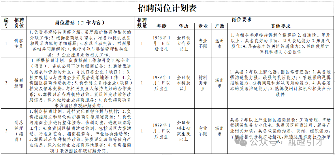温州市大学科技园发展有限公司是温州市瓯海区属国有企业瓯海经开集团下属子公司。公司结合区域发展需求,依托高校创新资源优势,在产业引培、服务融合、队伍提升等方面形成一套高效、规范的运行机制,持续助推科技源头创新、高校创新发展,服务地方产业转型升级。因工作需要决定面向社会启动招聘工作,现将相关事项公告如下: