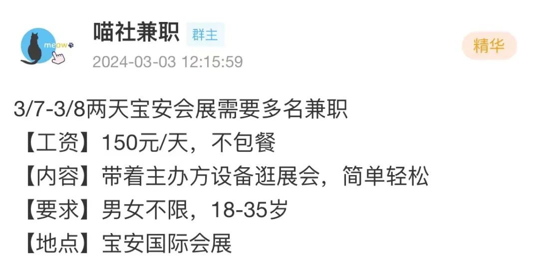另:若在兼职活动合作的过程中,遇到任何押金索取/服装费用/恶意克扣工资/恶意拖欠工资等任何活动方违规行为,均可在深圳喵社-曝光举报栏发布处理(不可涉及个人隐私)!