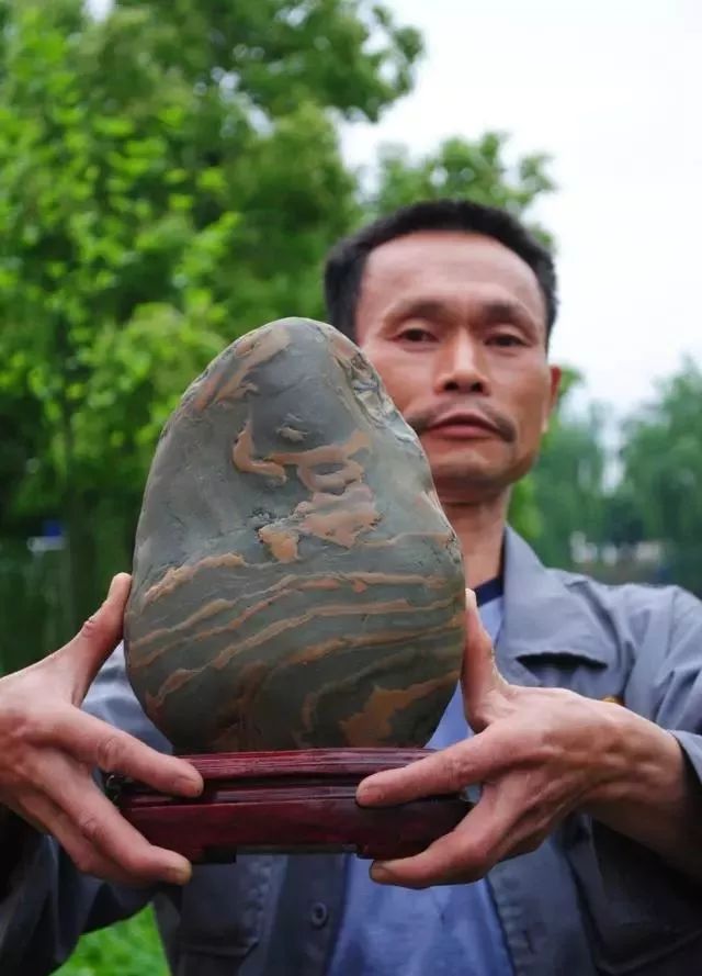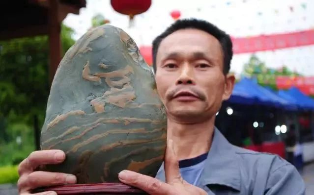 这块贵州青大约有6公斤重,呈青色,周身有橙黄色条纹缠绕,据说这块石头是他7年前,在大山里无意间捡到的,还给石头起了一个贵气十足的名字“富甲一方”!