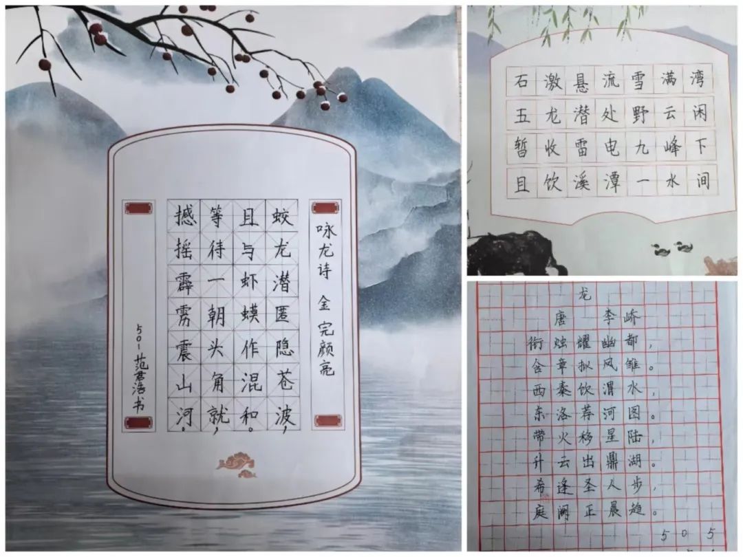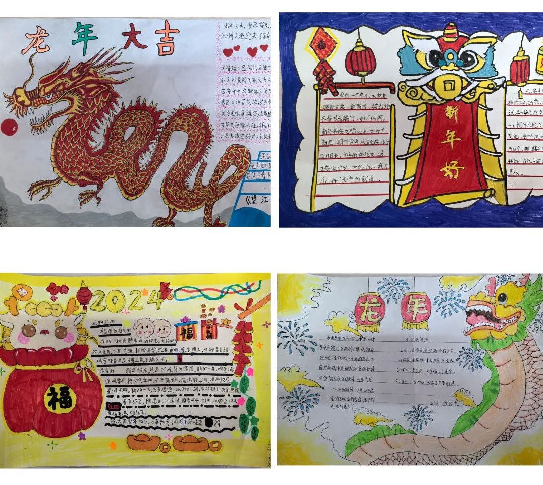 四年级的孩子们在阅读中积累了关于龙的成语、龙的诗句、龙的神话传说、龙的文化习俗等,将文字与绘画结合,一幅幅精美的手抄报记录了阅读的美好时光。