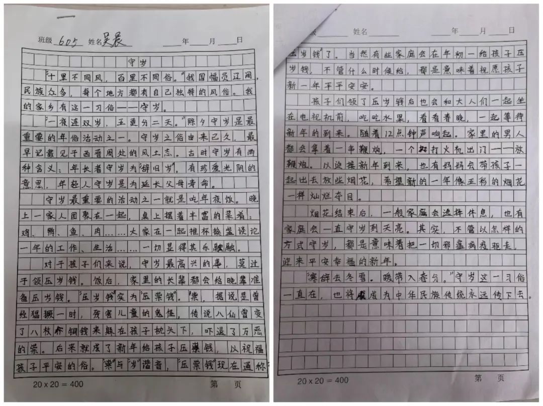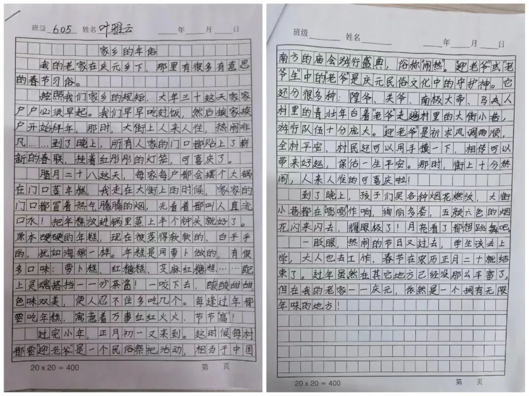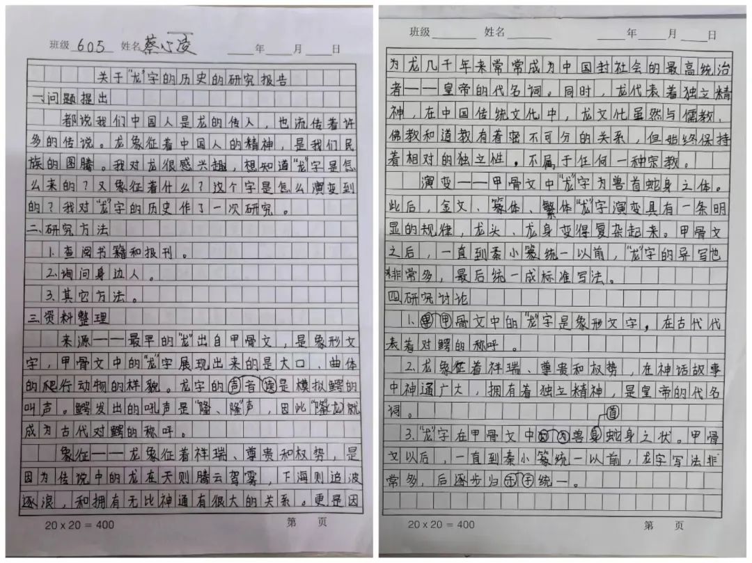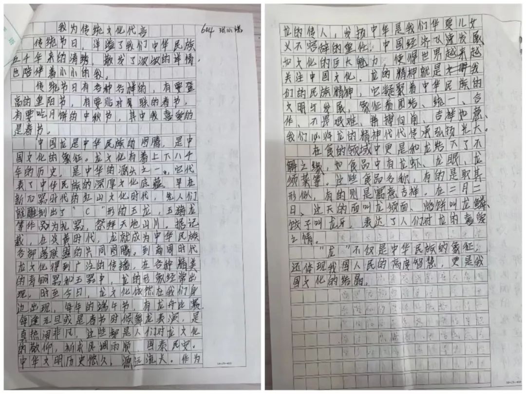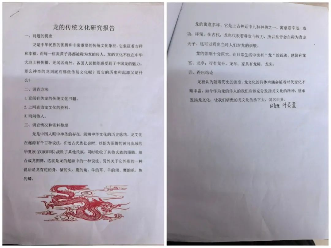 最美的事不是留住时光,而是留住美好回忆。六年级的孩子探索关于龙的传统文化,用实际行动感受春节习俗,体验春节传统文化,用笔尖记录调查的小报告或“我为传统文化代言”的作文。