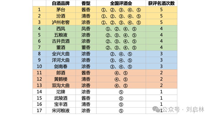 西凤、五粮液、古井贡酒、董酒获得4次;