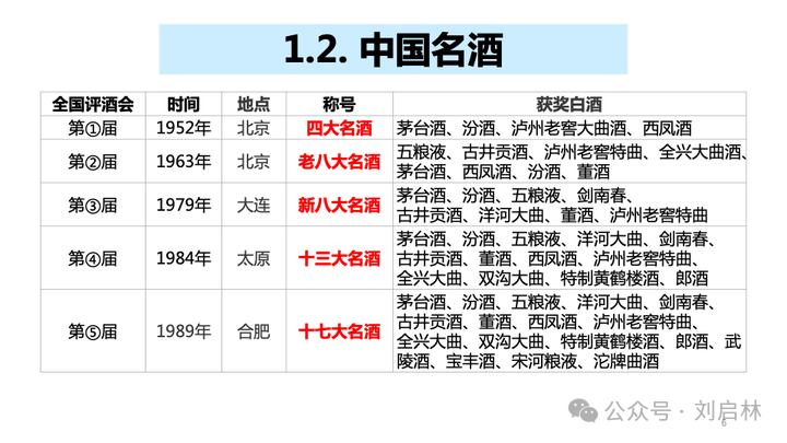 因为评选日期不同,中国名酒又分为:四大名酒、老八大名酒、新八大名酒、十三大名酒、十七大名酒。