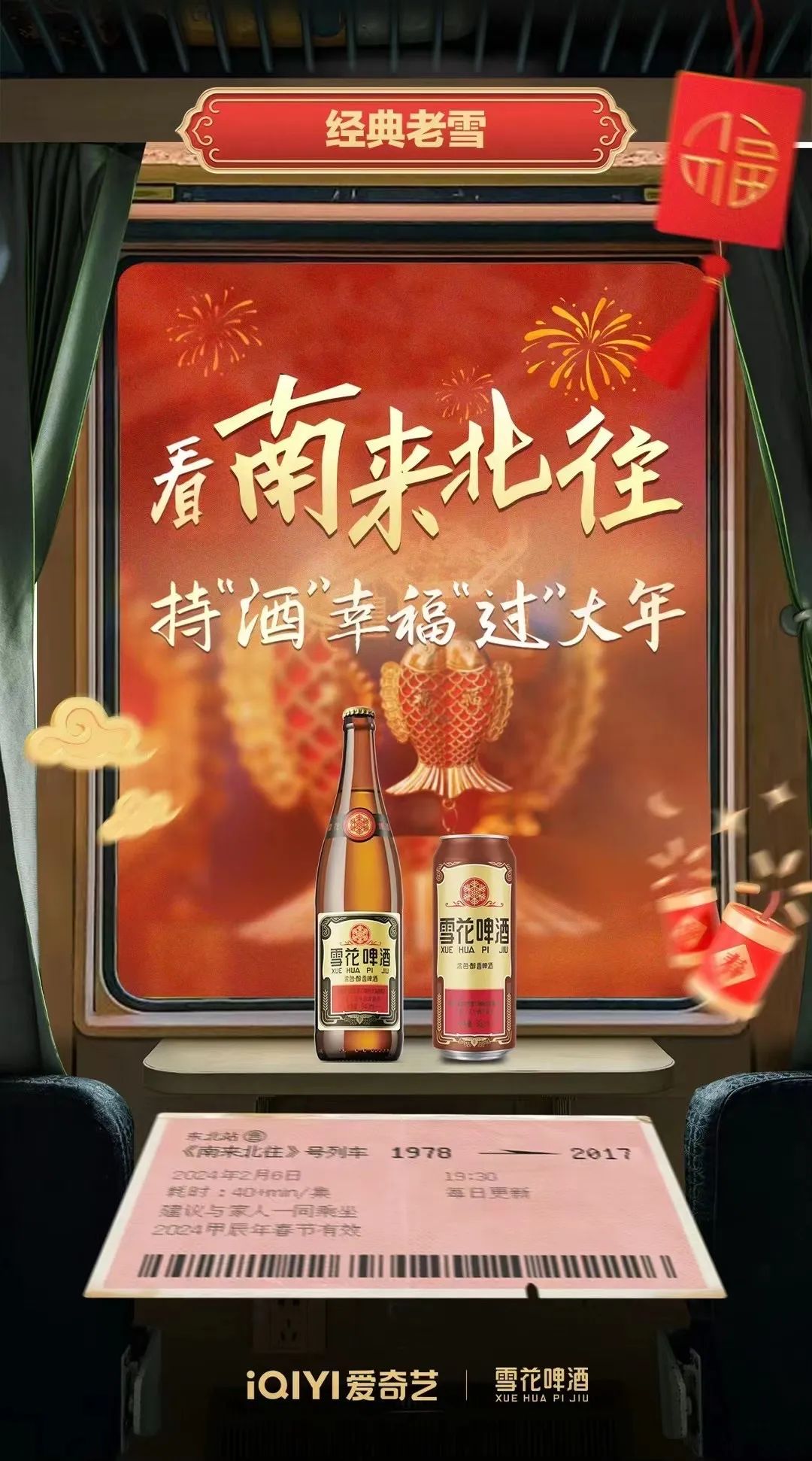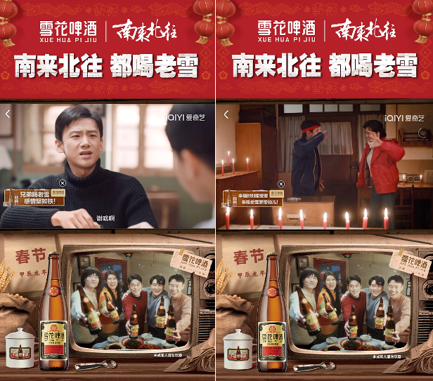 今年新春营销,经典老雪啤酒通过赞助爱奇艺开年大剧《南来北往》,通过“东北年文化”,出其不意的火了一把。剧集质量上,《南来北往》在央视八套破收视纪录,再创历史新高,凭借最高峰值4.0335%的惊人收视,跻身台播电视剧收视率第一名;同时,爱奇艺单集在线观看人数突破100万,剧集热度已至9959,不仅真正实现了「台网双爆」的亮眼成绩,也让经典老雪啤酒凭借极高的收视率流量造势,通过一系列剧内外营销方式,塑造“南来北往都喝老雪”品牌心智,在众声喧哗的新春营销中成功突围。