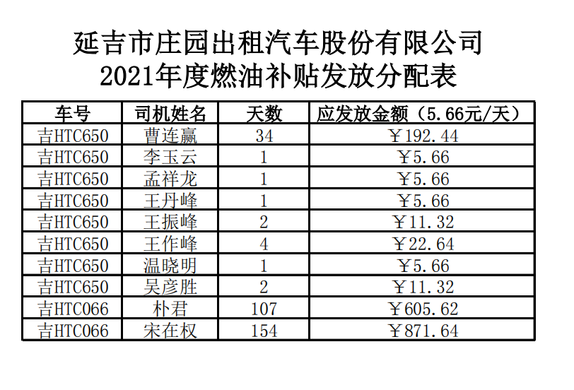 附件1:《延吉市庄园出租汽车股份有限公司2021年度燃油补贴发放分配表》