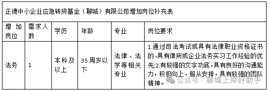 第一时间提供聊城市国考/省考/公务员/事业单位/教师/三支一扶/医疗/教师资格证/国企/银行/校招/选调等招考信息报名时间、职位表、进面分数、历年真题,提供报考政策咨询及免费备考干货。点击下方【聊城上岸好助手】关注并置顶或星标后即可每日收到聊城市最新招考信息速查。在正德中小企业应急转贷基金(聊城)有限公司2024年2月24日 8:00---2024年3月8日 15:00的招聘工作中,由于正德公司部分部门根据实际工作需要,增加了法务岗位,现予以公告:应聘人员年龄、职务年限、工作年限等计算截止时间为2024年1月31日。其他要求按照原公告执行。