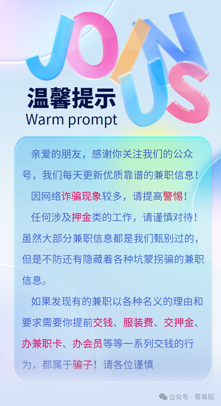 工资待遇: 300/天日结,水果饮料免费吃、可兼职全职