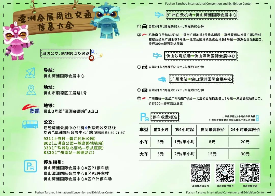 途经潭洲国际会展中心站点的常规公交线路有4条,主要辐射佛山中心城区、广州南站、北滘、陈村、乐从和龙江, 运营时间为6:30-21:30,市民可通过公交或城轨换乘公交等方式前往会场。4条公交线路均设“潭洲国际会展中心”站。